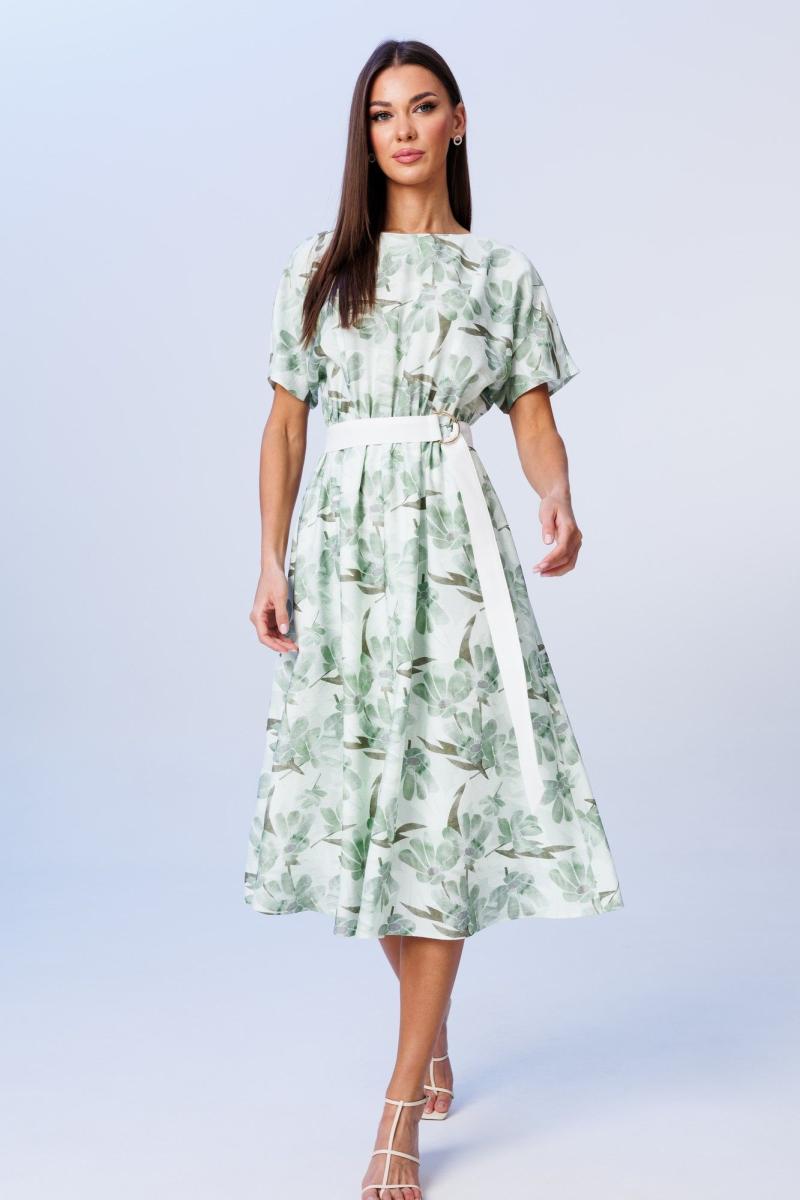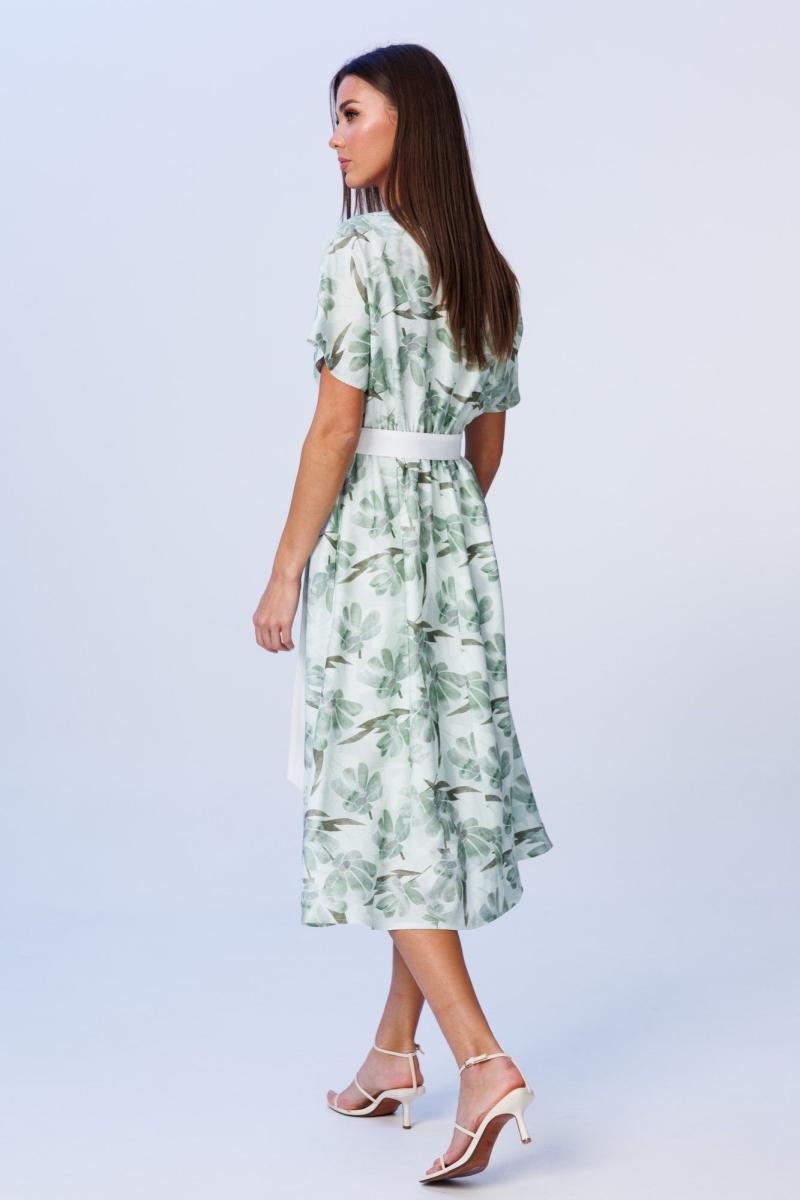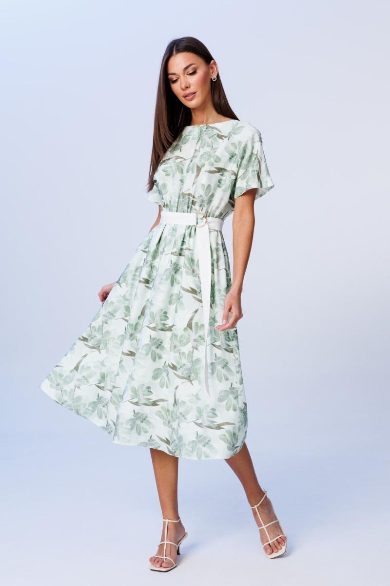Элегантное платье с роскошным принтом и удачной посадкой на фигуре. Платье отрезное по линии талии, округлой горловиной. Полочка состоит из центральной детали и вертикальных рельефных бочков, переходящих в цельнокроеные рукава укороченной длины. Длина рукава по плечевому шву от края горловины 31 см. Спинка с цельнокроеным укороченным рукавом «летучая мышь» имеет средний шов, в котором расположен у горловины разрез с пуговицей-застежкой. Юбка платья А-силуэта, состоящая из цельной детали спереди, сзади: средний шов. В боковых швах платья: внутренние карманы. Лиф платья с юбкой платья соединен швом, в который вставлена эластичная тесьма шириной 1 см. Юбка платья на подкладке. Длина платья по среднему шву спинки 113-115см (в зависимости от размерного ряда). Длина юбки платья от линии талии 78-82 см. Платье дополнено съемным текстильным поясом на пряжке. Представленная фурнитура может отличаться от представленной на фото/видео материале. Особые рекомендации: рекомендуется холодная деликатная ручная стирка, без использования отбеливающих СМС, без интенсивного трения. Сушка в вертикальном положении. ВТО с минимальным паром.