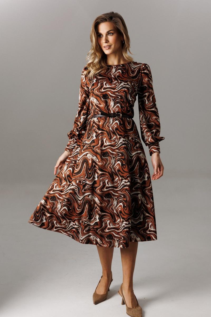 Стильное платье из трикотажного полотна. Платье отрезное по линии талии, имеет нагрудные и талиевые вытачки. В среднем шве спинки расположена застежка-молния. Нижняя часть платья по крою «полусолнце». Рукав втачной, одношовный. По окату имеет сборку, у запястья присобран на притачной манжет, высотой 8 см, с застежкой петли-пуговицы. Длина рукава 65 см. Длина платья по спинке 112 см. К платью рекомендован ремень (в комплекте) для дополнительной фиксации талии, также служит декоративным элементом (фурнитура может отличаться от представленной на рекламном фотоматериале).