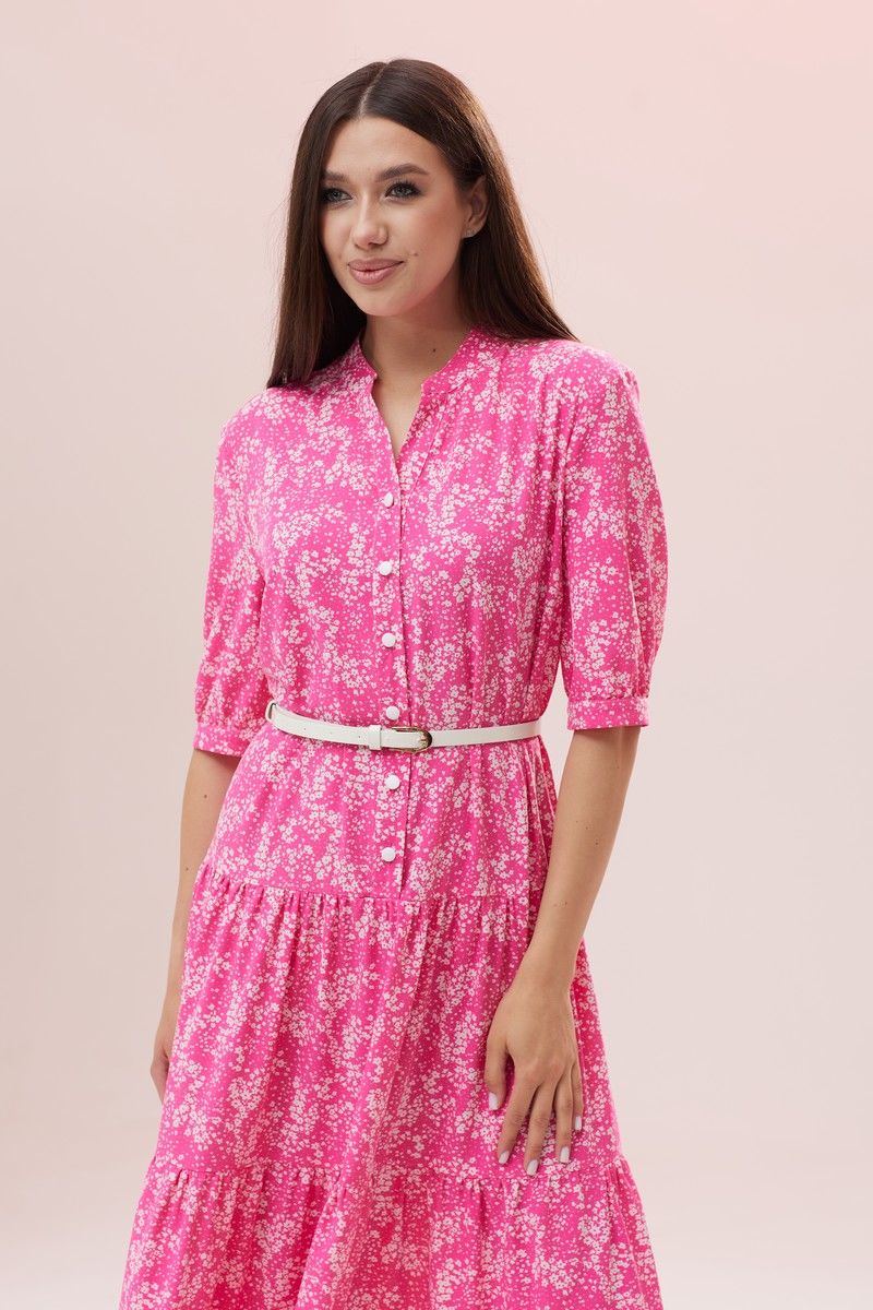 Легкое, воздушное, летнее платье состоит из отрезного удлиненного лифа и юбки, состоящей из трех горизонтальных воланов со сборкой. Спереди лиф платья имеет нагрудные горизонтальные вытачки и вертикальную функциональную планку-застежку на петли-пуговицы. Горловина обработана воротником-стойкой. Рукав втачной, одношовный. Низ рукава с лаконичной сборкой, на манжете с застежкой. Длина рукава 34 см. Длина платья по спинке 121 см. Платье дополнено ремнем, который по желанию подчеркнет изящество фигуры.