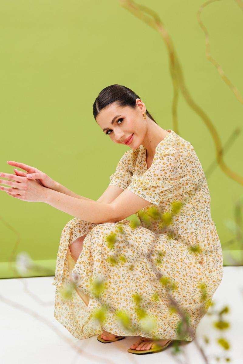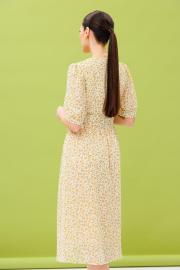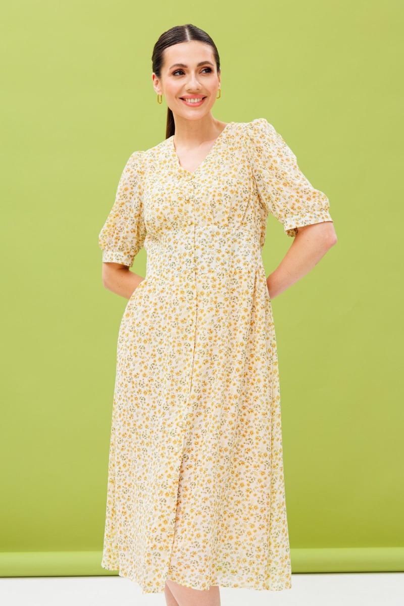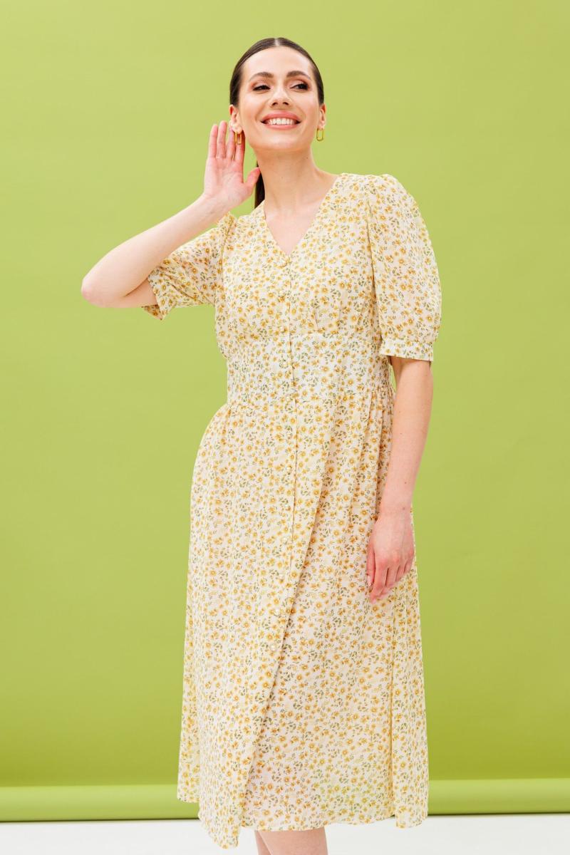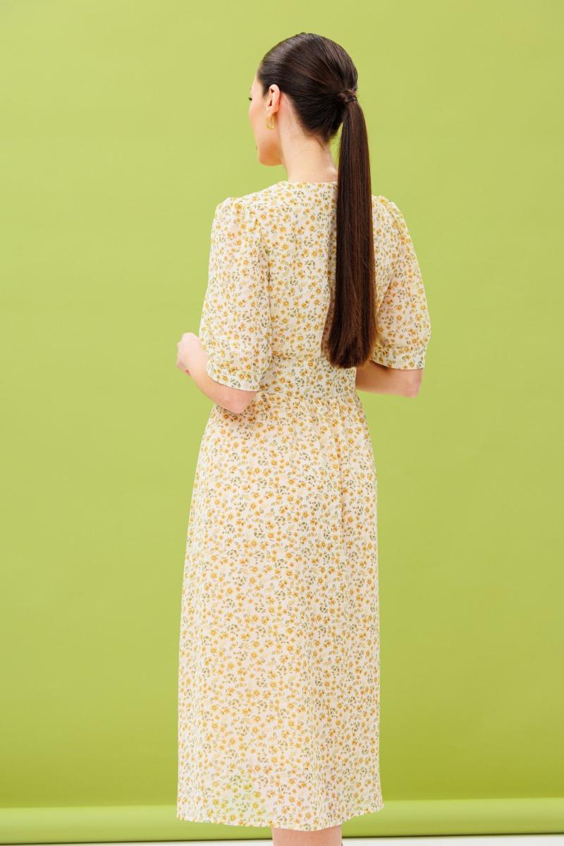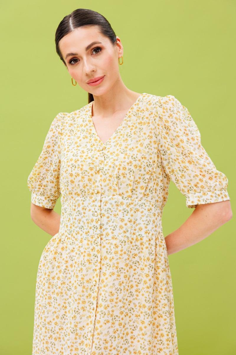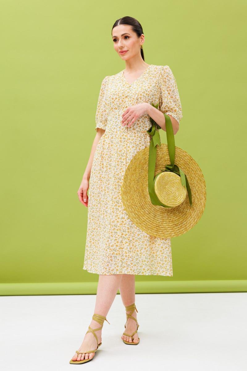 Воздушное летнее платье из натуральной вискозы. Изделие состоит из отрезного лифа, спереди со складками на обьем по линии груди, по спинке-сборку и юбки с расклешением к низу. Лиф и юбку соединяют облегающие рельефные детали, имитирующие фигурный корсет, высотой от 7,5 -12см. Горловина имеет V-образный вырез. Рукав короткий: 30 см на свободной манжете. По окату и низу рукава-сборка. Спереди платье имеет застежку на петли-пуговицы. Длина платья по спинке 112 см.