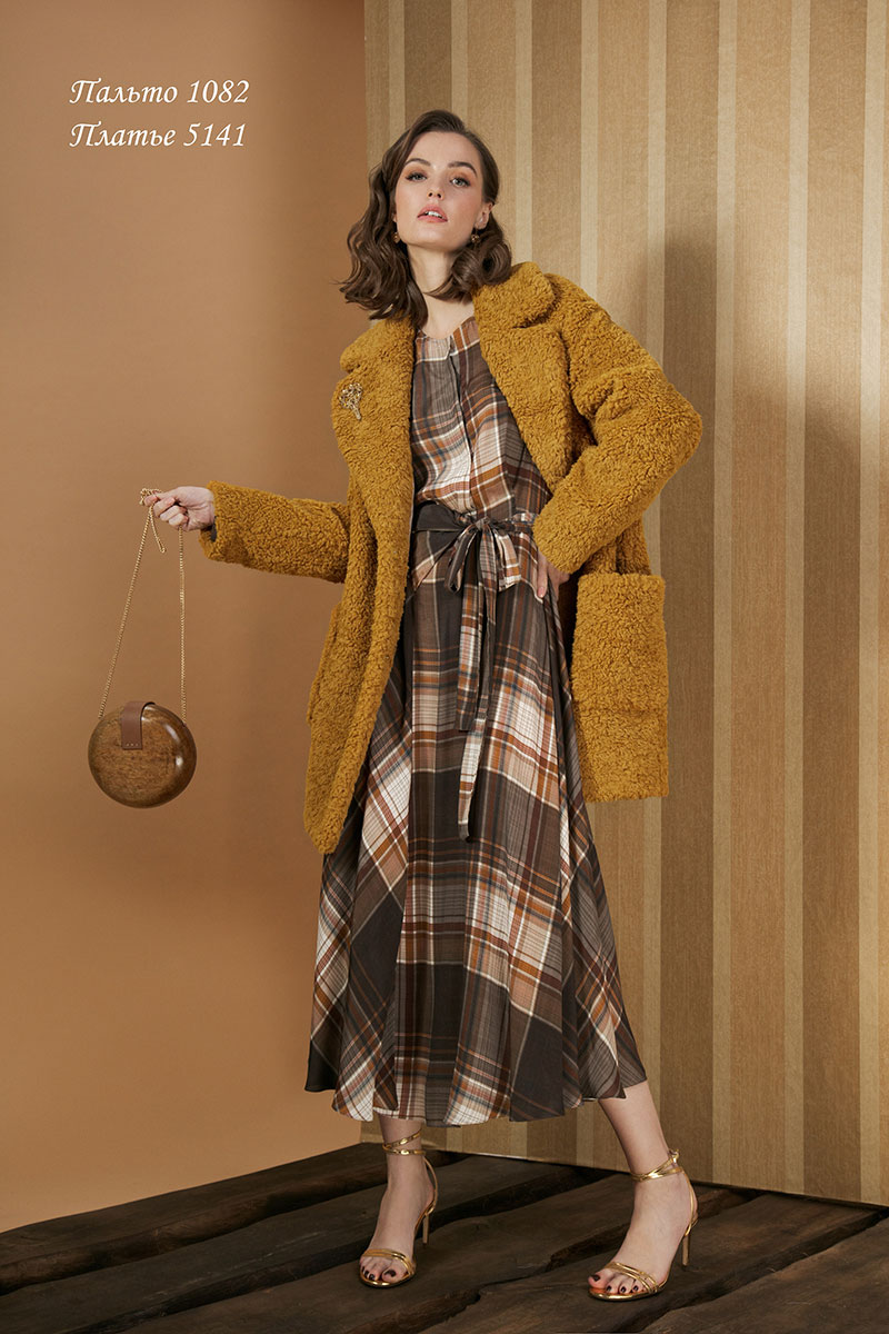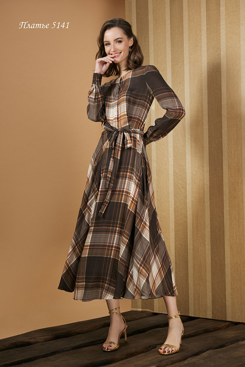 Платье-рубашка слегка приталенного силуэта, отрезное по линии талии. Застегивается спереди на пришивные золотые декоративные кнопки. Выполнено из струящейся, шелковистой, вискозной ткани. Завязывается спереди на декоративный пояс - бант. Красивое конструктивное решение пояса придает особую привлекательность платью.