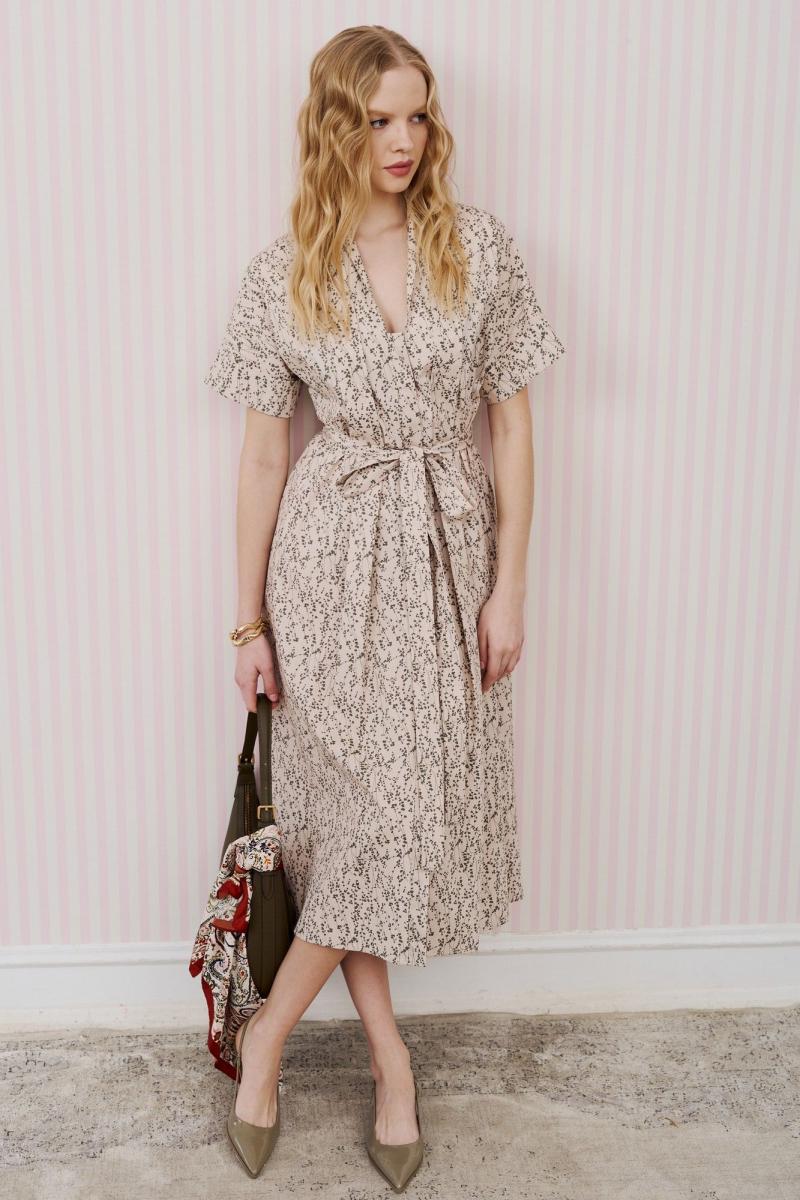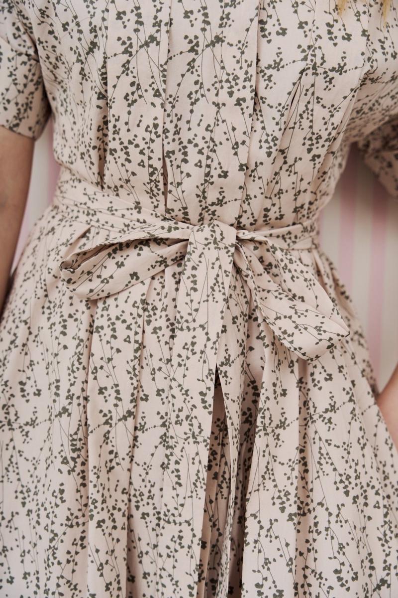 Платье полуприлегающего силуэта, выполнено из хлопковой ткани. Рукав спущенный, по низу рукава манжета. V-образный вырез горловины, застежка потойная на притачную планку, в боковых швах карманы. По переду от плеча складка, по спинке средний шов и вытачки. К платью прилагается пояс. Длина по спинке от высшей точки горловины: 124 см Длина рукава от горловины: 35 см ОГ: 94-98-102-106-110 см (размер 42-44-46-48-50) ОТ: 86-90-94-98-102 см (размер 42-44-46-48-50)