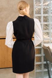 Платье полуприлегающего силуэта, выполнено из костюмной ткани. Рукав втачной длинный, выполнен из хлопка. По верхней и нижней части рукава сборка, по низу рукава манжета на застежку на петли и пуговицы. По горловине воротник рубашечного кроя. По левой стороне складка имитирующая запах. Выше линии груди пришиты металлические пуговицы. По спинке средний шов переходящий в застежку на потайную молнию.