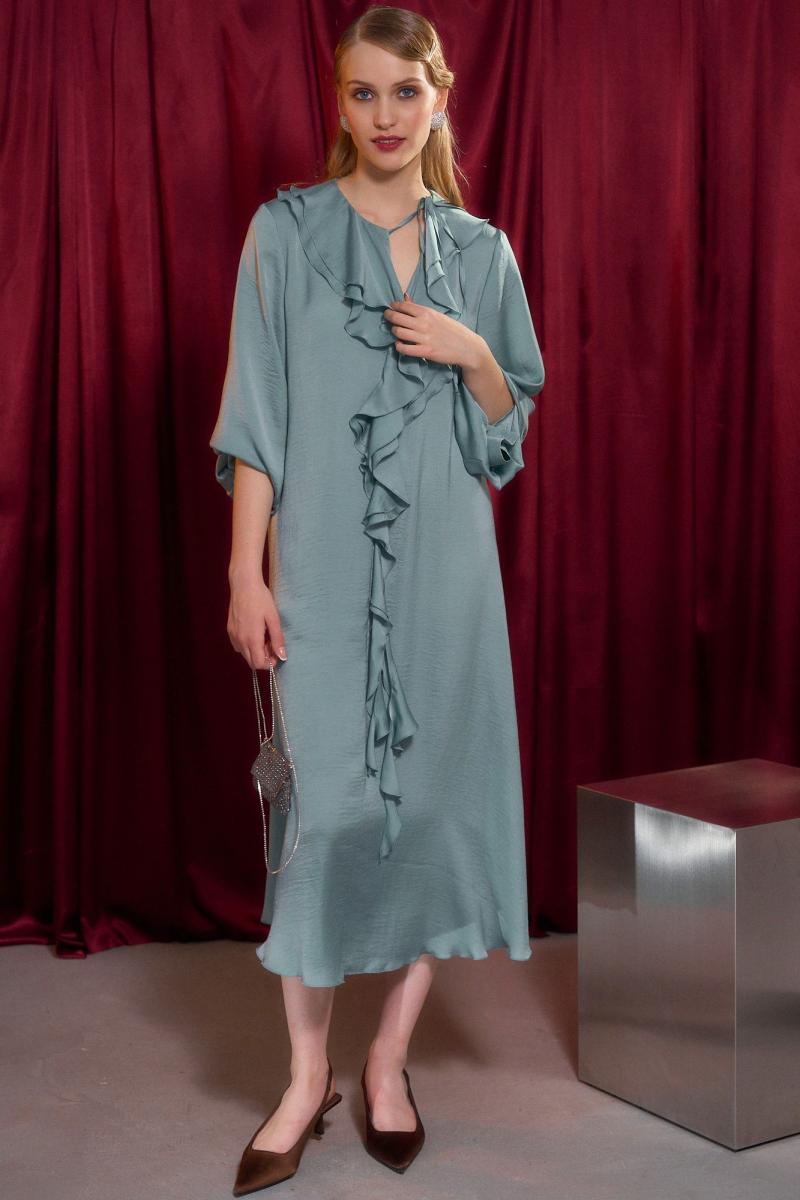 Платье свободного кроя, А силуэта. Рукав втачной на манжете. В Y-образный вырез горловины вшиты воланы. По горловине застежка на завязку. Длина по спинке от высшей точки горловины: 122 см Длина рукава: 64 см ОГ: 110-114-118-122-126-130-134-138 см (размер 42-44-46-48-50-52-54-56) ОТ: 104-108-112-116-120-124-128-132 см (размер 42-44-46-48-50-52-54-56) ОБ: 120-124-128-132-136-140-144-148 см (размер 42-44-46-48-50-52-54-56)