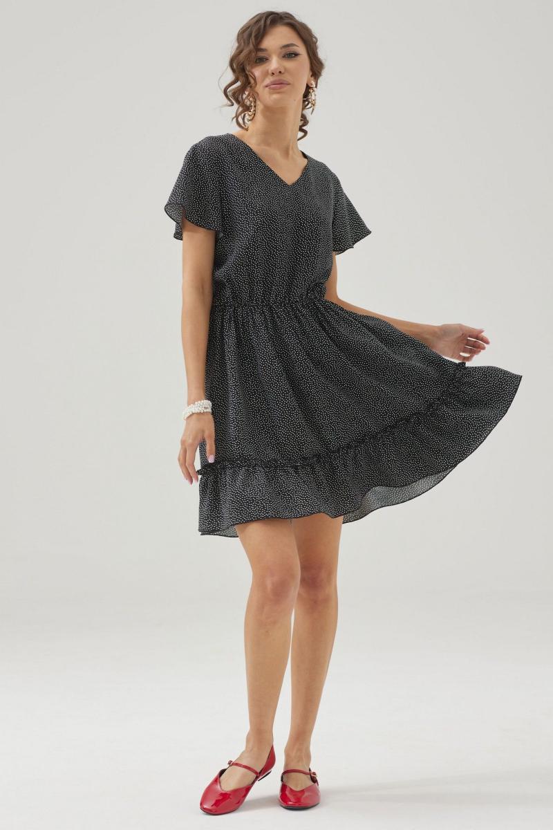 Платье полуприлегающего силуэта расширенное книзу из штапеля. Горловина V-образная. Рукав втачной, расширенный книзу. Платье отрезное по линии талии, в подрез вставлена резинка. По низу юбки волан со сборкой. Длина платья: (42-46р - 88см); (48-52р - 92см) Длина рукава: (42-46р -16см); (48-52 - 18см) .