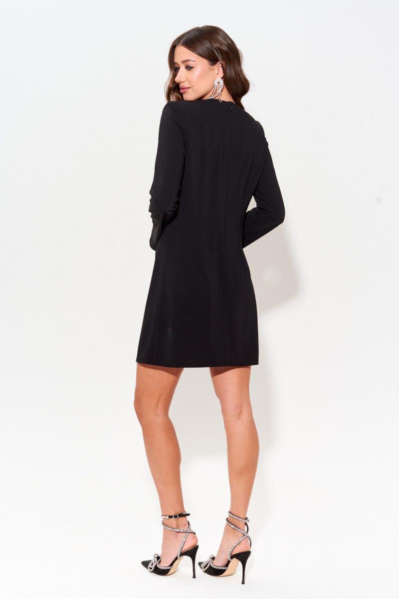 Нарядное платье длины мини, приталенного силуэта. По переду платья расположен v-образный вырез, с шнуровкой из декоративного шнура из страз. Рукав втачной, прилегающий. По спинке расположены талиевые вытачки и потайная молния. Обращаем ваше внимание, что фурнитура может незначительно отличаться от фото. Длина рукава 63 см. Длина изделия 42-46 85 см 48-50 89 см.