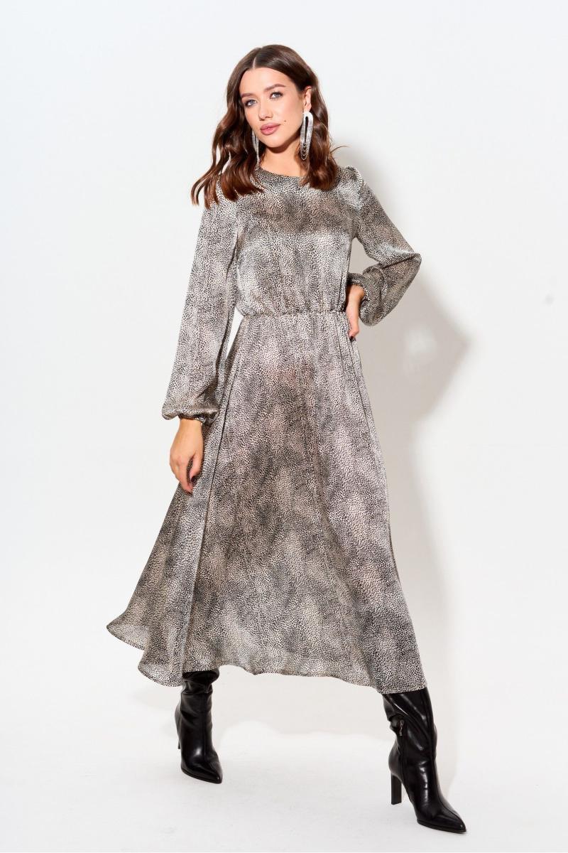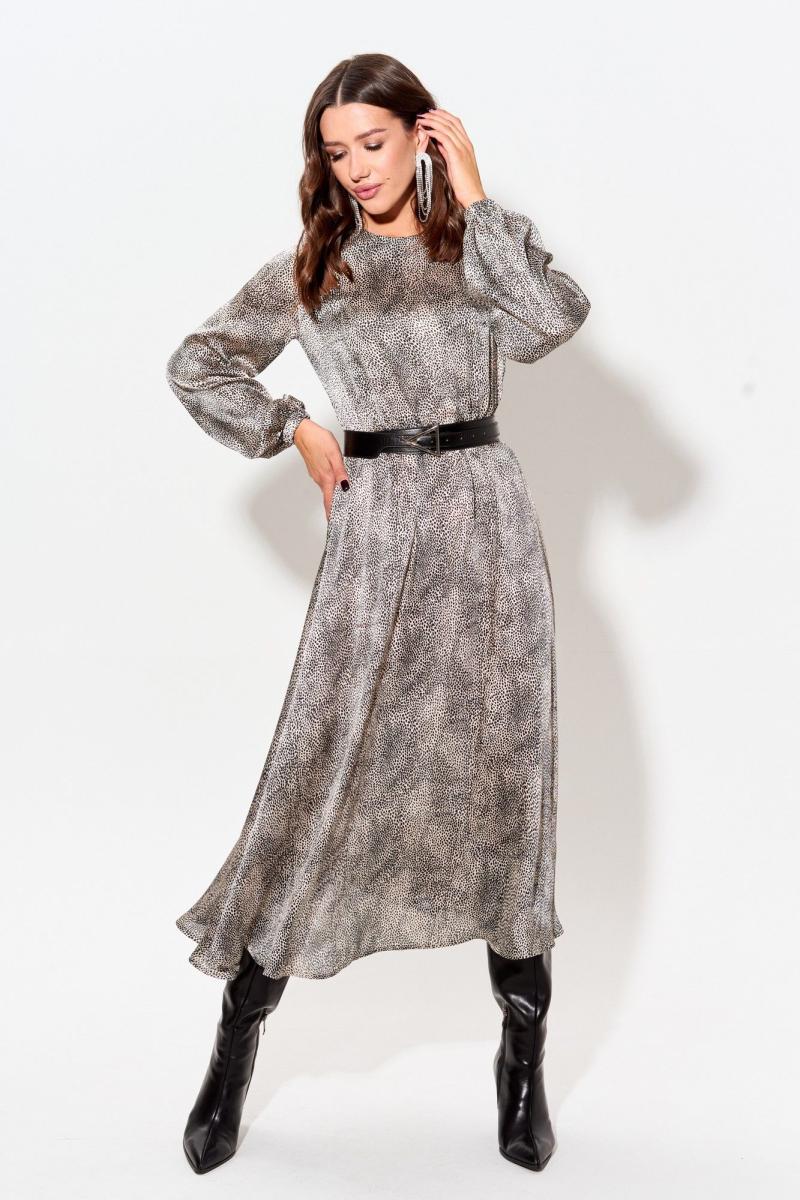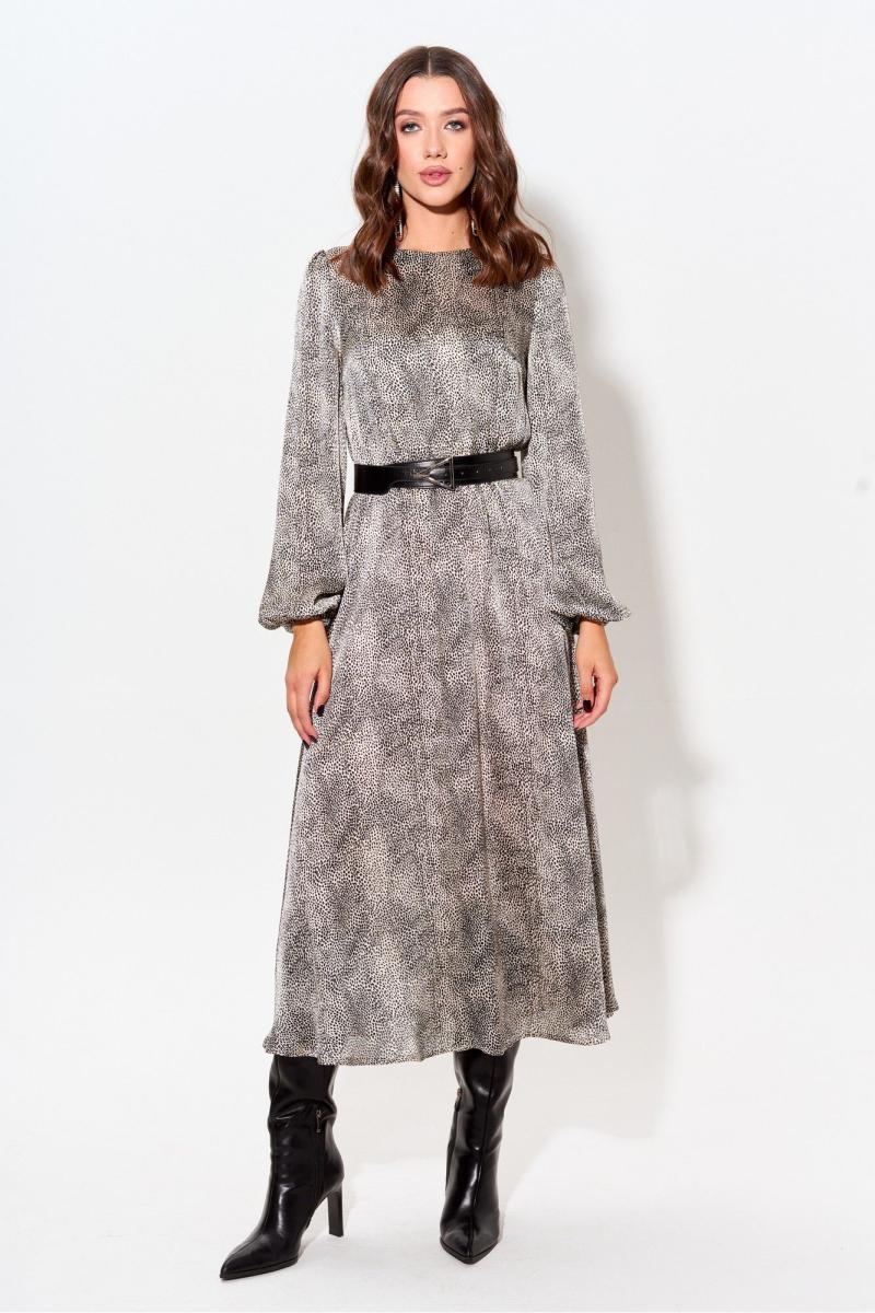 Стильное платье полуприлегающего силуэта из плательной ткани с принтом. Горловина округлая. На спинке декоративный вырез с застежкой на петли и пуговицы. Рукав втачной, по окату сборка, по низу манжета на резинке. Платье отрезное по линии талии, в подрез вставлена резинка. В комплект входит съемный пояс. Обращаем ваше внимание, что фурнитура может незначительно отличаться от фото. Длина изделия 128 см Длина рукава 65 см