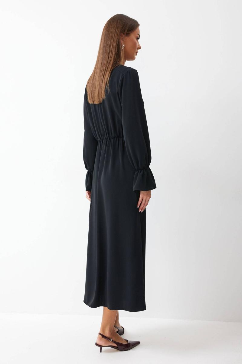 Платье полуприлегающего силуэта из струящейся ткани. В области талии расположен подрез, с эластичной тесьмой. Рукав втачной, со сборкой по плечу, по низу волан, собранный на резинку. Юбка А-силуэта. Платье дополняет съёмная деталь в виде баски из эко кожи, с шнуровкой в боковом шве.