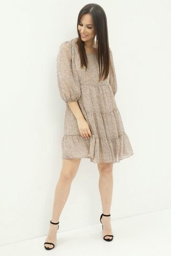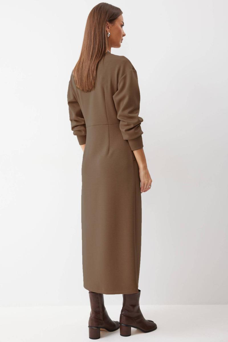 Платье полуприлегающего силуэта из трикотажного полотна. Горловина округлая. Рукав со спущенной линией плеча по низу манжета. Платье отрезное по линии талии. По переду на талии складки. В боковом шве функциональные карманы. В центральном шве юбки разрез. Длина платья 126см |