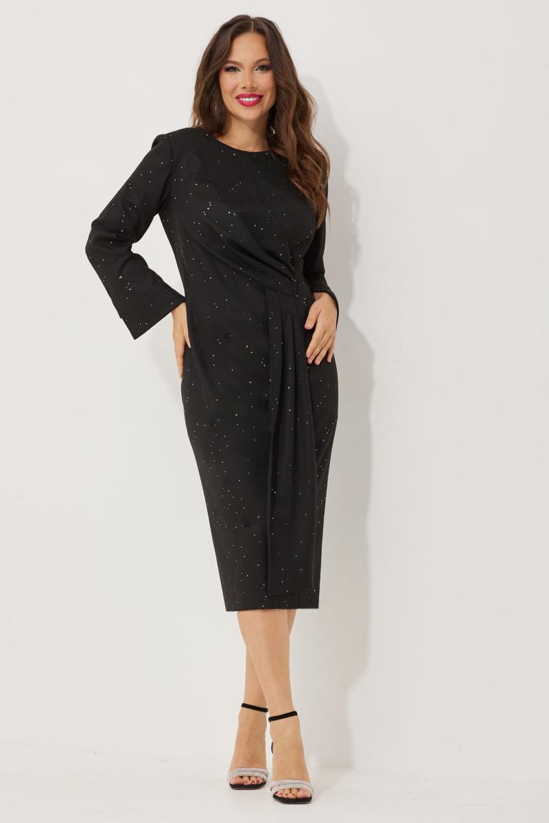 Элегантное платье полуприлегающего силуэта. Выполнено из костюмной ткани с россыпью мерцающих пайеток. По спинке застежка на потайную молнию. По переду платье дополнено красивой драпировкой. Горловина округлой формы. Рукав втачной с оригинальным низом. Длина платья от плечевого шва106см. Длина рукава 56см .
