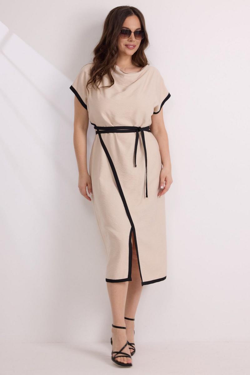 Элегантное платье свободного кроя. Выполнено из комфортной поливискозной ткани с легким эффектом сжатости. Низ платья выполнен с эффектом запаха. Рукав цельнокроеный, короткий. По спинке застежка на потайную молнию. Приталено по талии съемным поясом. Платье дополнено контрастной отделкой. Длина платья от плечевого шва 114см. Длина рукава 20см.