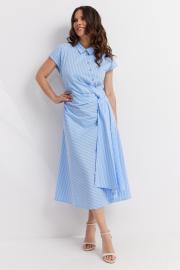Стильное платье приталенного силуэта. Выполнено из хлопковой ткани. Рукав цельнокроеный, короткий. Горловина обработана отложным воротником. Центральная застежка выполнена с асимметрией, что придает платью уникальность. Низ платья расширен к низу. На талии оригинальная драпировка. Длина платья от плечевого шва 122см. Длина рукава 15см.