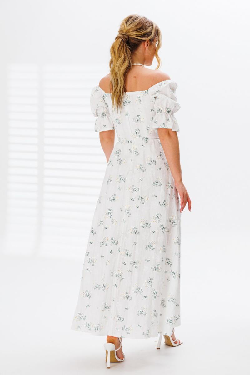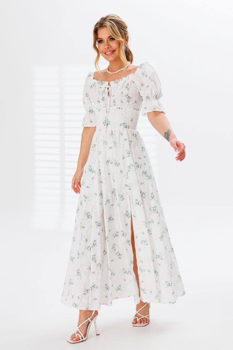Платье отрезное по линии талии. Верхняя часть с отрезным лифом, подрез фигурный. По верхнему краю лифа кулиска, в которую вставленны завязки формирующие драпировку. В верхней части среднего шва спинки застежка на потайную молнию. Рукав длинный, объемный, на уровне выше локтя сборки выполненные посредством эластичных строчек ниткой и резинкой. Разрез по передней половине платья. Платье на хлопковой подкладке. Длинна юбки от талии-95 см.Длина рукава - 34 см. Длина по спине - 119-123 см