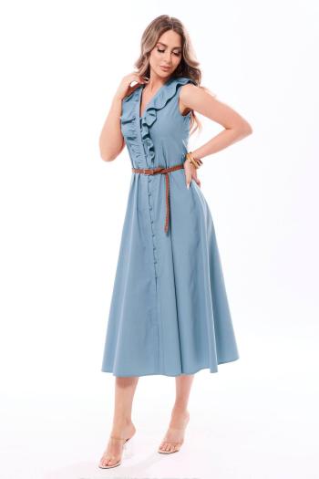 РЕМЕНЬ В КОМПЛЕКТ НЕ ВХОДИТ! Летнее платье полуприлегающего силуэта, отрезное по линии талии, со слегка присборенной у линии талии юбкой. Платье выполнено из шифона, на подкладке из 100% хлопка. Лиф платья с рельефами, застежкой на навесные петли и пуговицы, фигурным вырезом горловины. Рукав платья втачной, короткий, слегка присборен у оката и манжеты. Спинка с талиевыми вытачками. Потайная застежка-молния в боковом шве платья. Платье дополняет декоративный ремень.