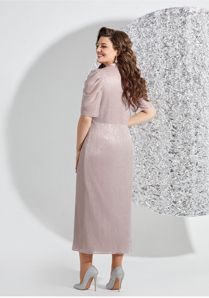 Нарядное платье прилегающего силуэта, выполнено из атласа и плиссированной ткани, на трикотажной подкладке. Лиф платья отрезной по линии талии, выполнен из атласа, с эффектом корсета, кокетки платья выполнены из плиссированной ткани, присборены. Атласная часть лифа с рельефами, по середине вставка, декорированная стразами. Юбка платья прямого покроя, по переду на запах, от линии талии на юбке заложены складки, при движении появляется небольшой разрез по низу. Спинка платья отрезная по линии талии, выполнена из плиссированной ткани, на трикотажной подкладке, со средним швом и выточками, в боковом шве потайная молния. Рукав втачной, укороченный, выполнен из плиссированной ткани, со сборкой по окату. Изящное платье в сочетании нежных фактур создает образ элегантной и романтичной женщины. в 52р. Ширина груди- 53см, Ширина талии -47см, Ширина бедер- 58см, длина рукава- 30см, ширина рукава 18,5см.