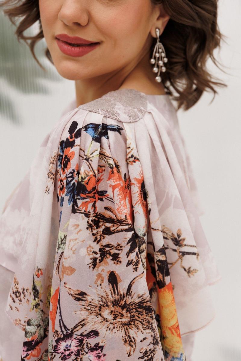 Женское платье свободного силуэта, выполнено из принтованного шифона, на трикотажной подкладке. Лиф платья отрезной по линии талии, на резинке, горловина округлой формы, обтачена подкладкой. По плечам выполнены небольшие кокетки, декорированные кружевом. К кокеткам притачены воланы со складками, расклешенные к низу, выполняют функцию рукавов. Юбка платья расклешенного силуэта, спинка идентична поло, отрезная по линии талии, на резинке, по горловине выполнена застежка на петлю-пуговицу. Эффектное платье с необычным элементом декора прекрасно подойдет на любой тип фигуры, а нежный принт на шифоне сделает ваш образ романтичным!