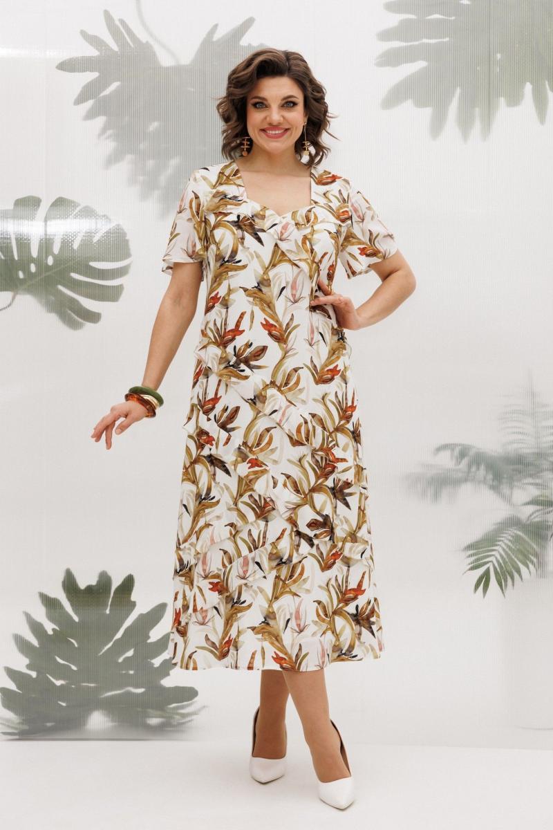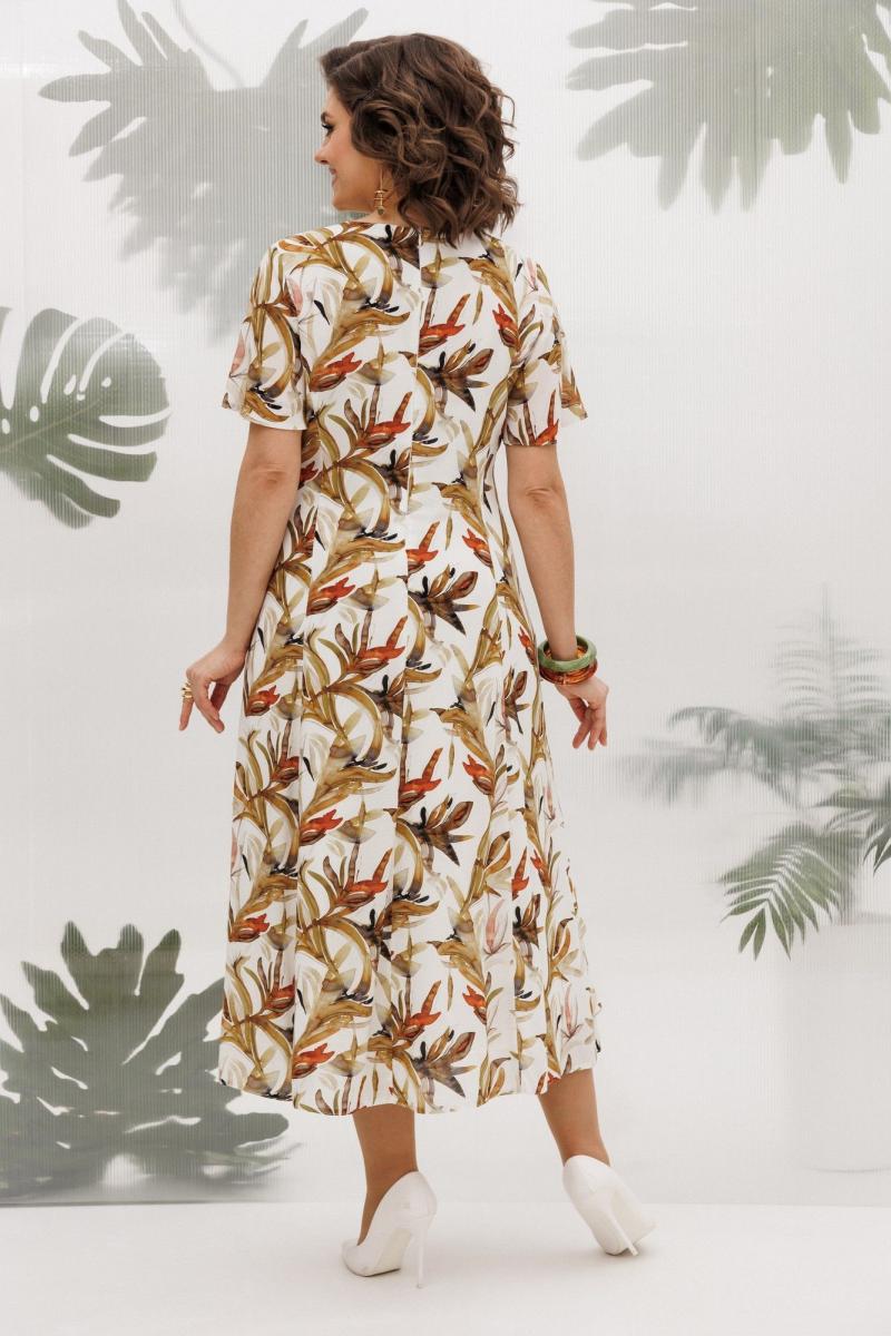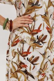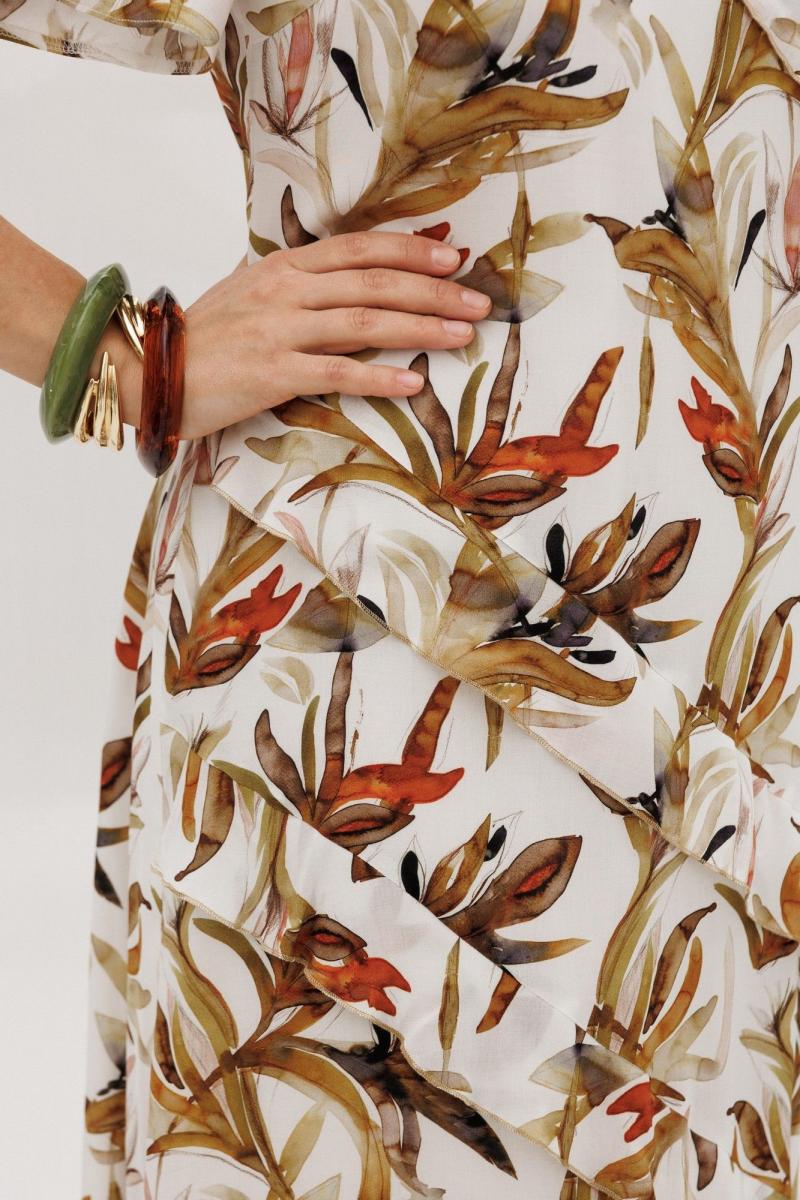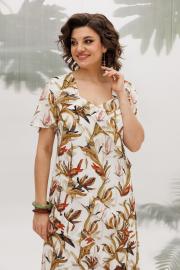 Летнее платье полуприлегающего силуэта, выполнено из штапеля с принтом, на подкладке. Горловина фигурной формы, на обтачке, также на полочке обработаны кокетки, от кокетки и горловины идут воланы из основной ткани. Также на полочке выполнены ассиметричные подрезы с воланами. Рукав втачной, расклешенный, выполнен из основной ткани, оптимальной длины. Спинка с средним швом и вытачками, в среднем шве потайная молния, платье к низу расклешенное. Легкое, летнее платье из приятной к телу ткани отличный выбор для летнего дня!