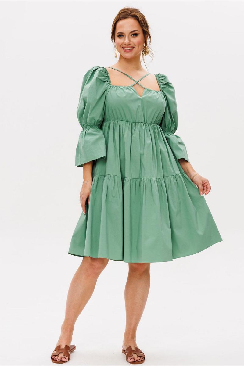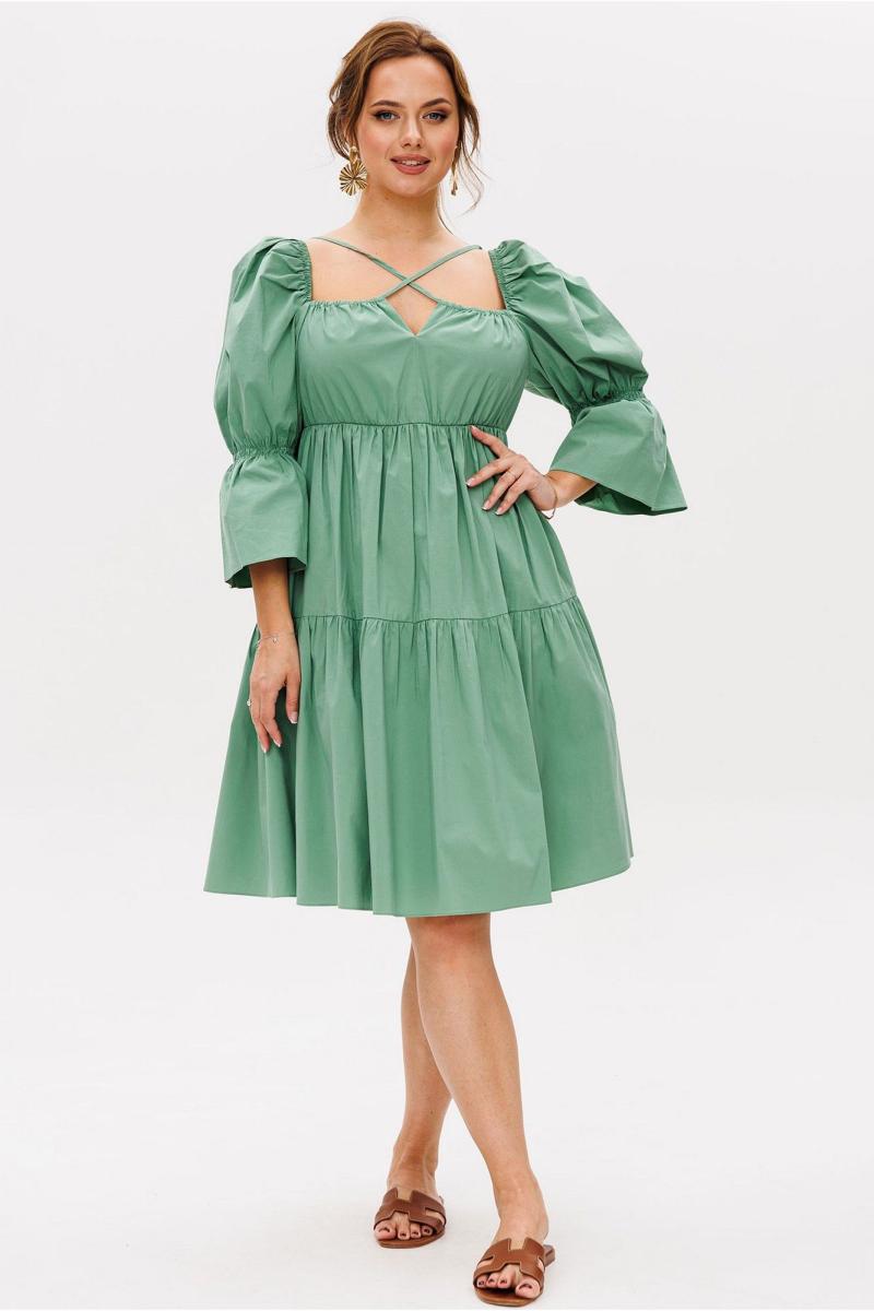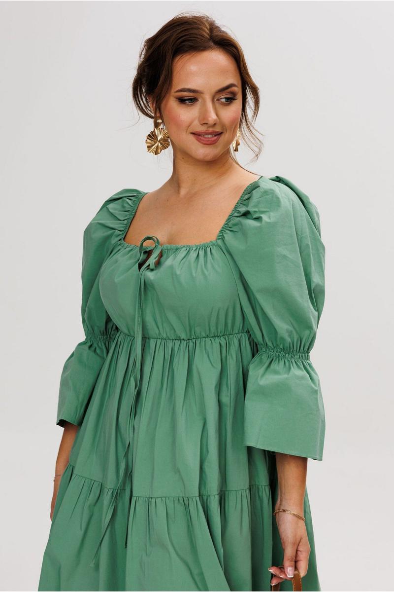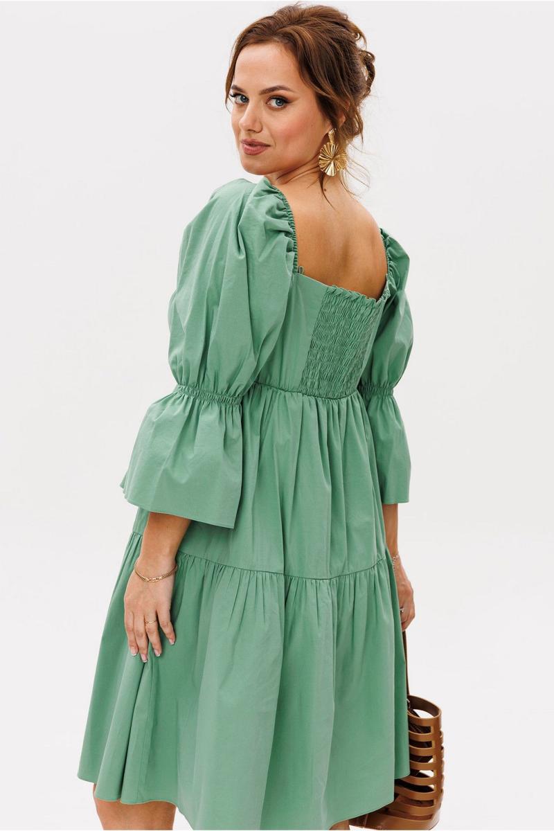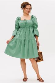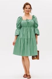 Платье женское отрезное выше линии талии, свободное. Центральная часть спинки стянута на резинку «венгерку». Горловина фигурная, регулируется завязками. Окаты рукавов стянуты на тонкую резинку. Рукава одношовные втачные, на уровне локтевого сгиба рукав стянут резинкой «венгеркой». Платье без подкладки.
