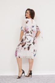 Платье женское А-силуэта, круглая горловина окантована и плавнопереходит в заявязку на спине. Спинка со средним швом, у горловины разрез. Рукав втачной, одношовный. Низ рукава на резинке и регулируется завязками. Платье на подкладке.