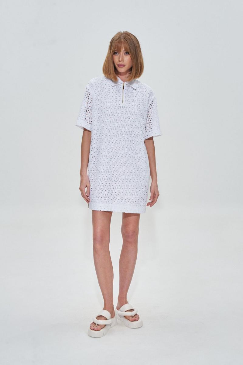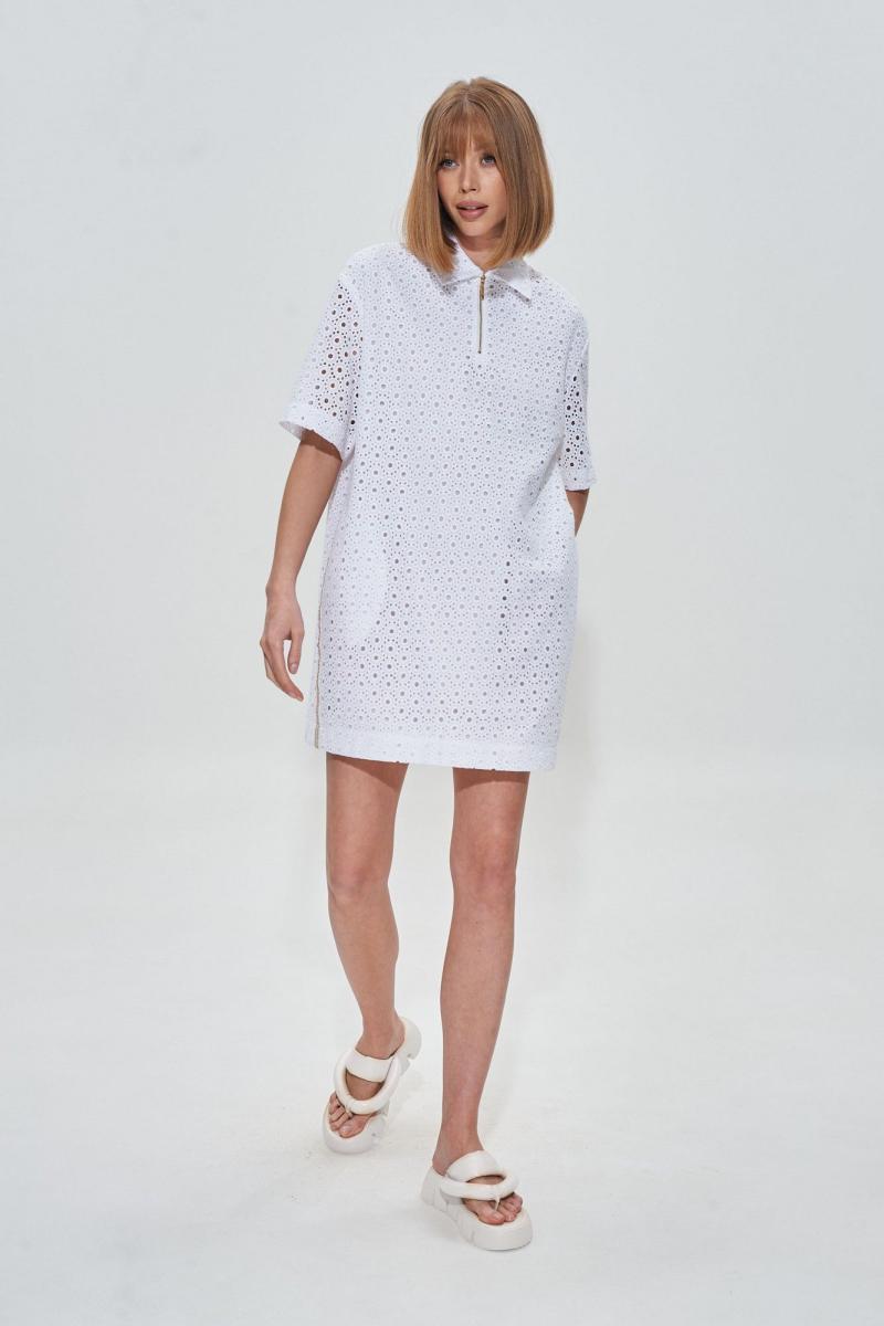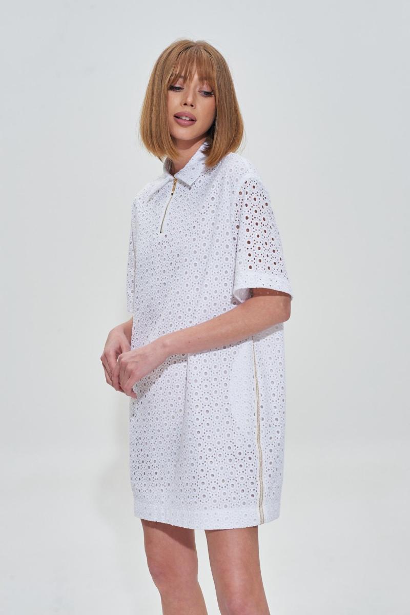 Платье поло из белоснежного шитья премиального качества. Изделие на хлопковой подкладке, застежка молния, по бокам декоративная тесьма. Длина платья 84 см Длина рукава от воротника 44 см