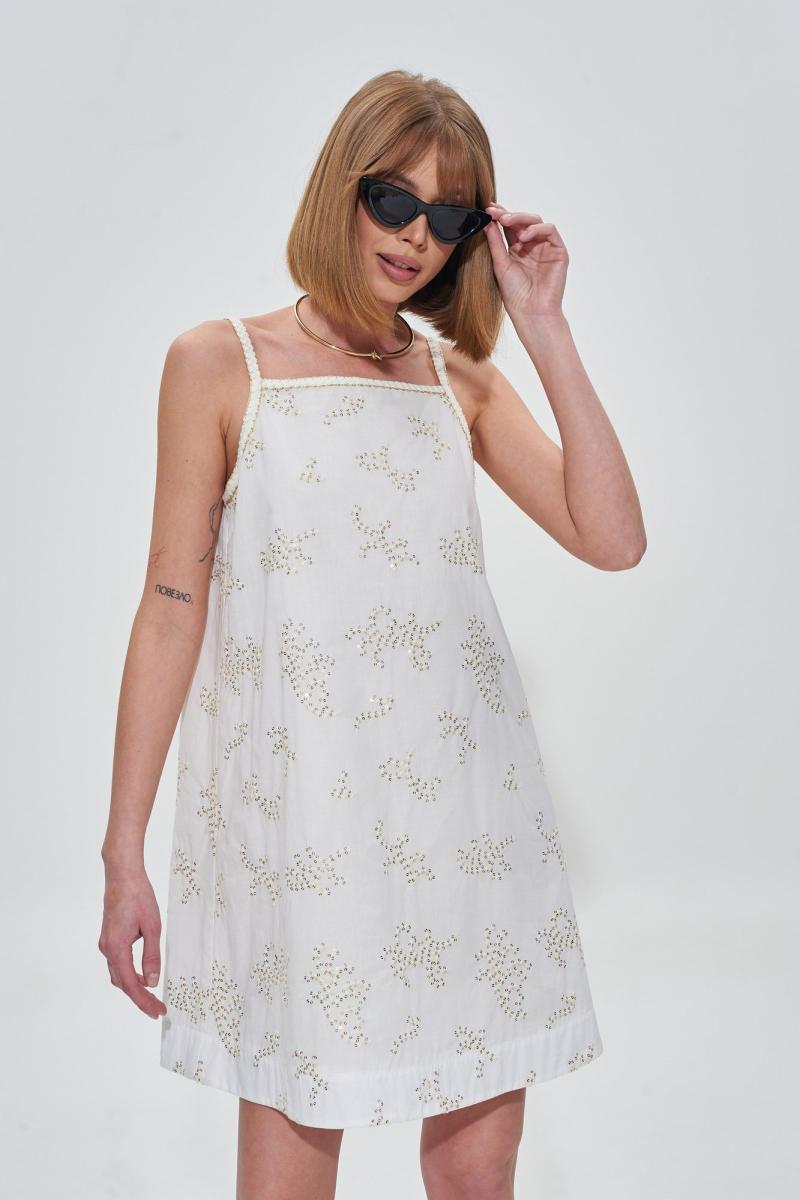 Отличное решение на жаркое лето! Платье в стиле супермодели Твигги! Силуэт трапеция из хлопковой ткани. На ткани выполнена вышивка с использованием золотистых пайеток. Узор прекрасно переливается на солнце! Бретели и горловина декорированы тесьмой. Платье на легкой хлопковой подкладке. Полотно позволяет коже дышать и чувствовать себя свободно. Длина платья 87 см