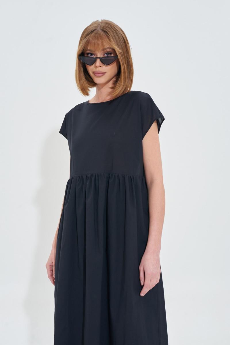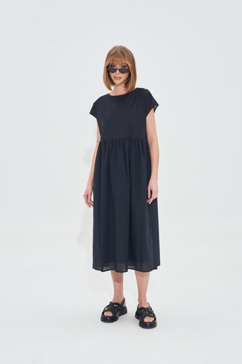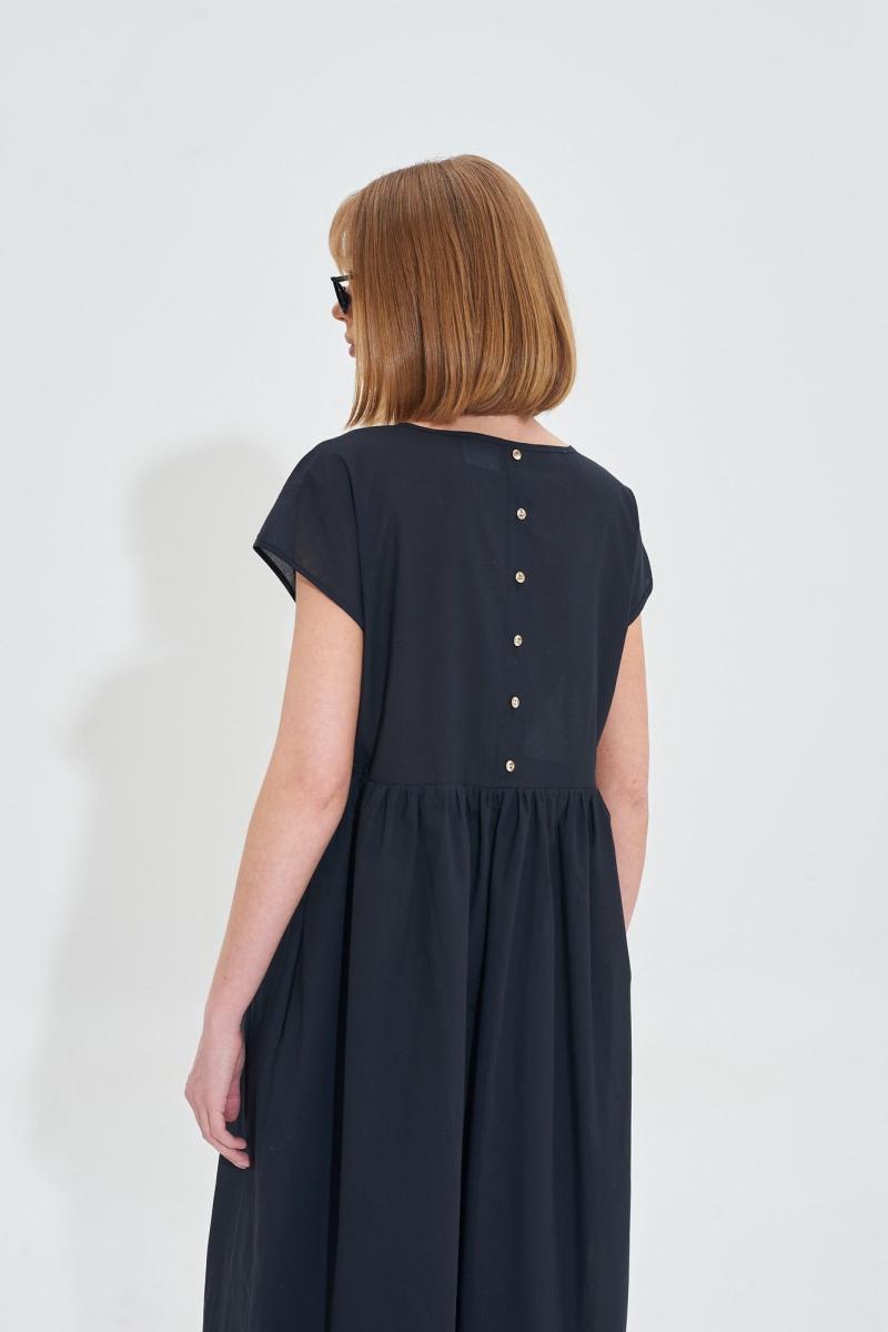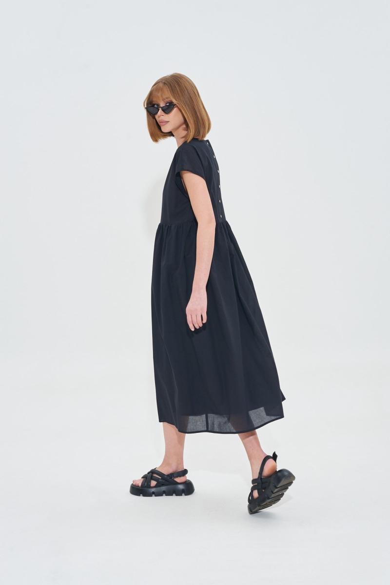 Платье свободного силуэта из легкой хлопковой ткани. На спинке планка с золотистыми пуговицами. Длина платья 120 см