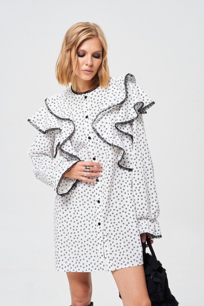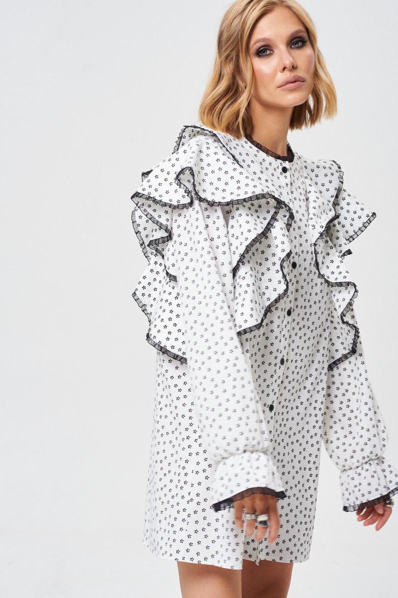 Платье свободного силуэта, декорировано воланами с тесьмой. Эти элементы создают неповторимый образ и отличают от всех стандартных платьев. Вы точно обратите на себя внимание! Длина платья 93 см Длина рукава от воротника 77 см. Замеры платья. ОГ 42-44 р-р - 106 см, 46-48 р-р - 110 см ОТ 42-44 р-р - 106 см, 46-48 р-р - 110 см ОБ 42-44 р-р - 106 см, 46-48 р-р - 110 см