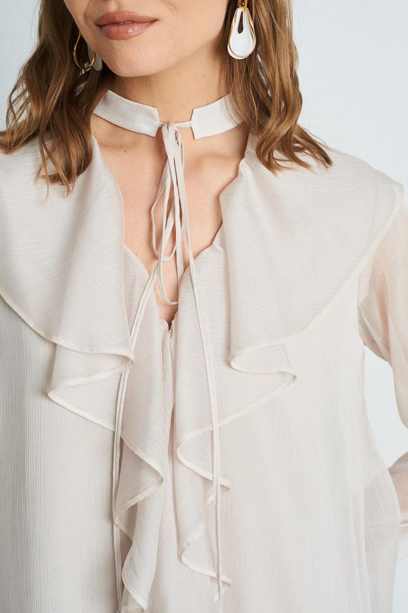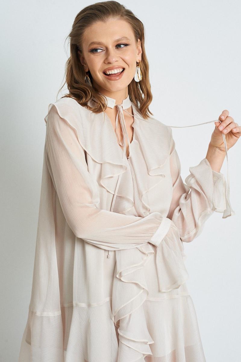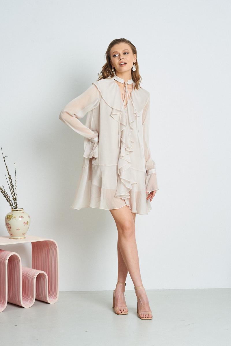 Платье из летящей струящейся ткани. Платье свободного силуэта, декорировано рюшами. Платье на подкладке. Длина платья 88 см Состав 100% ПЭ