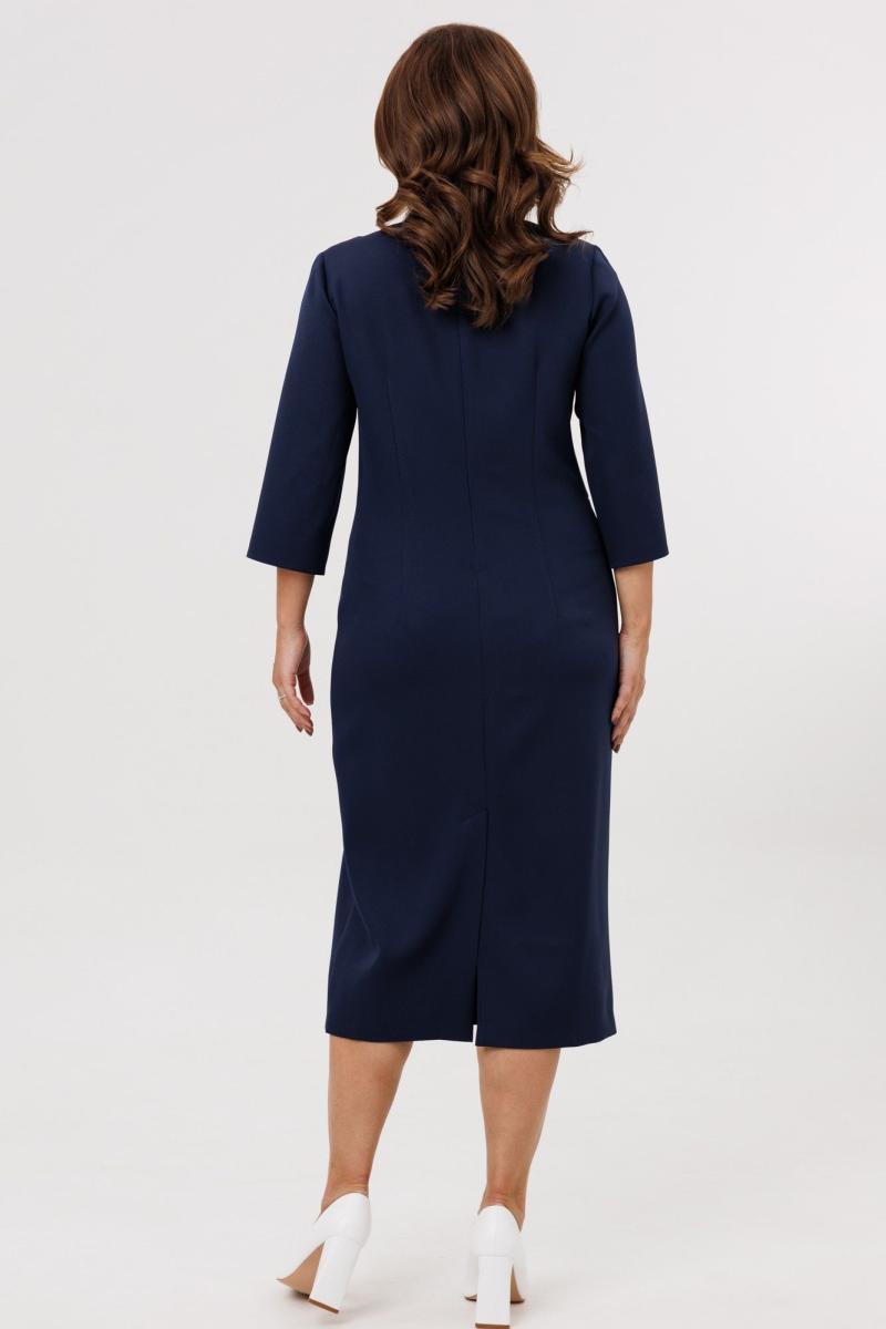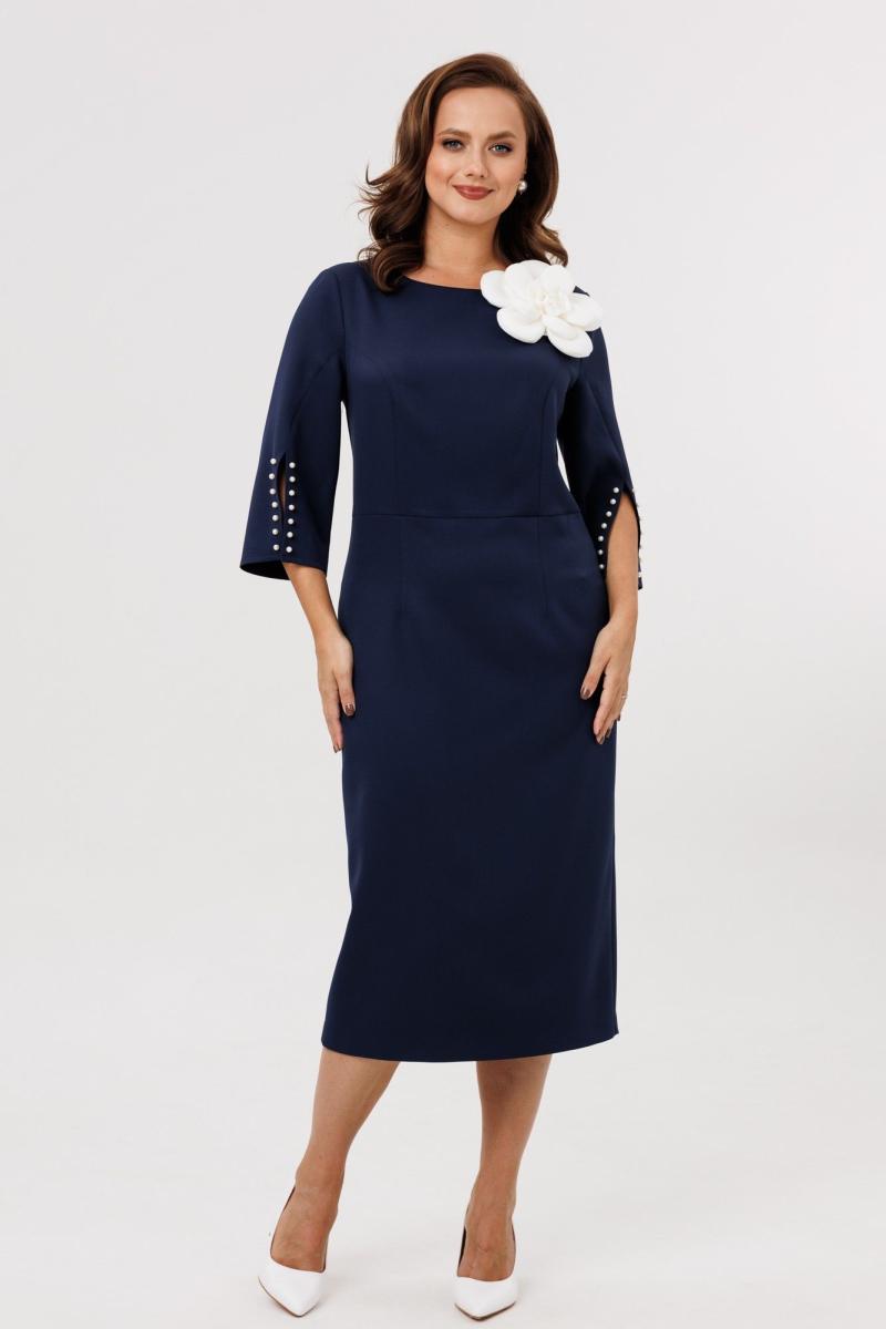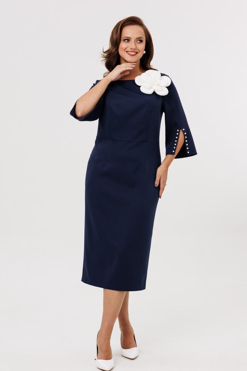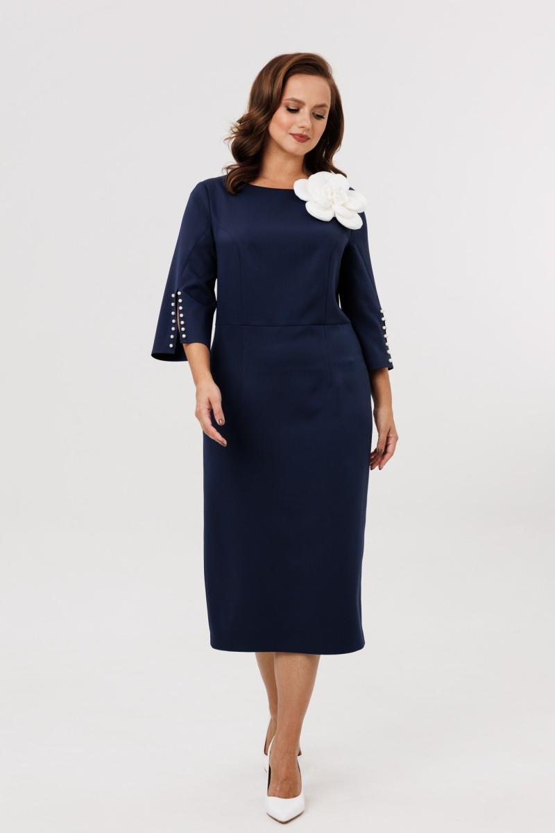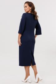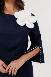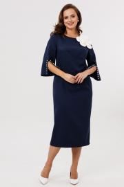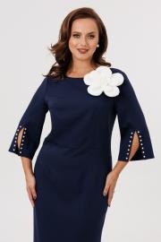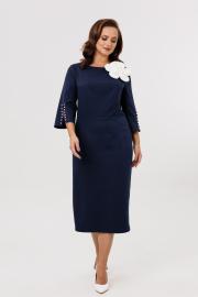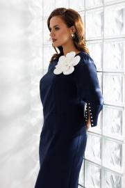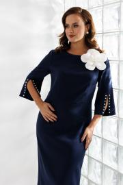 Нарядное женское платье полуприлегающего силуэта, отрезное по линии талии. Выполнено из плательной ткани (чуть тянется). Рукав втачной ¾ с разрезом и декоративными бусинами (жемчуг) по низу рукава. Спинка с застежкой на потайную тесьму-молнию (длина 50 см). По низу платья шлица. Декоративным элементом в платье является съемный цветок. Платье без подкладки.