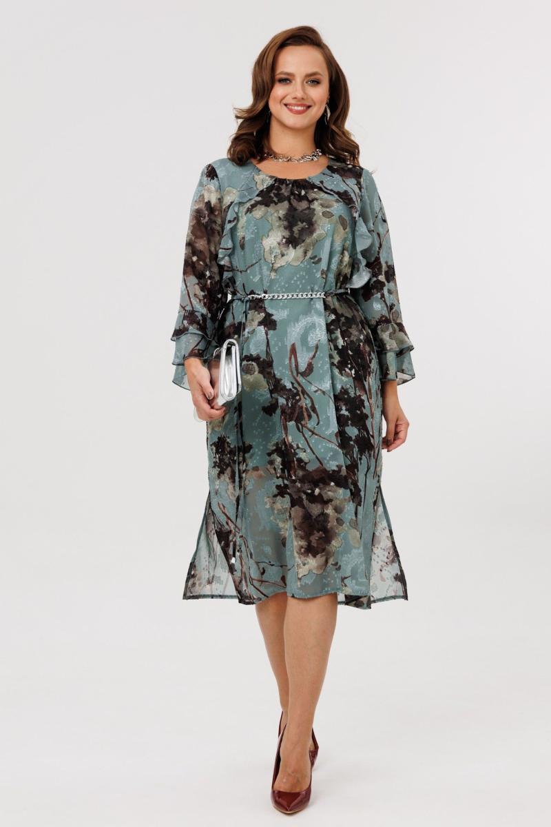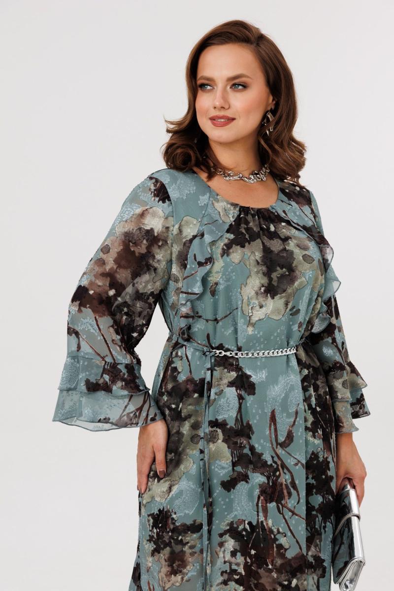 Элегантное женское платье А-силуэта, выполненное из плательной шифоновой ткани (не тянется), на подкладке (тянется). По переду наклонные подрезы, в которые вставлены воланы. Горловина округлой формы, присборенная резинкой по центру. Спинка цельная. Рукава втачные, одношовные, длиной 7/8. По низу рукавов два притачных волана. В комплект входит пояс из основной ткани с декоративной цепочкой.