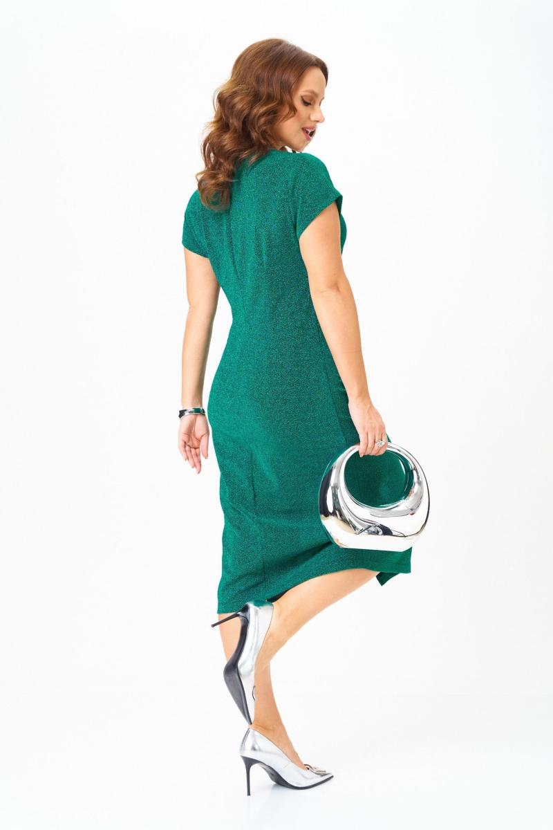 Нарядное женское платье полуприлегающего силуэта со спущенной линией плеча, выполненное из крепа на трикотажной основе с люрексом (легкое мерцание). Полотно эластичное. По левой части переда рельефный шов, переходящий в разрез. По правой части переда в области талии – мягкие складки от рельефного шва. По спинке средний шов. Горловина округлой формы, обработана окантовкой. Платье без подкладки и без застежки.