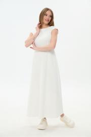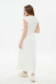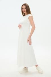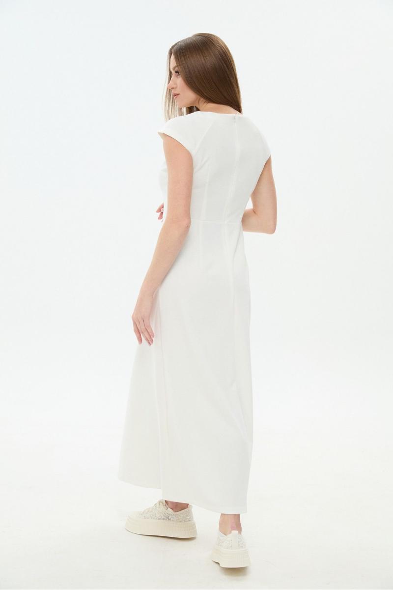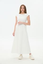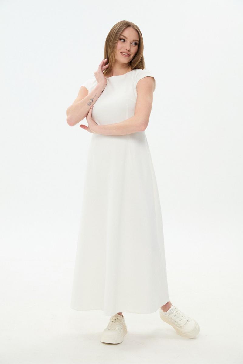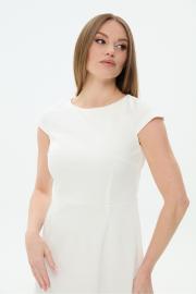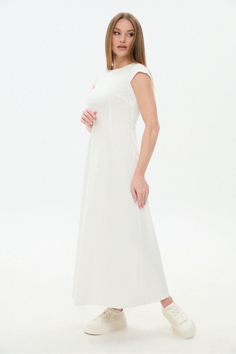 Платье длиной миди отрезное по линии талии приталенного силуэта. Нижняя часть платья имеет небольшое расклешение.Прилегание по переду создано за счет нагрудных вытачек, переведенных в боковой шов, и талиевых вытачек. На спинке талиевые вытачки и средний шов. Застежка платья на потайную молнию в среднем шве спинки. Плечевой пояс оформлен кокетками по переду и спинке, напоминающими по форме рукав реглан. Плечо немного приспущено.