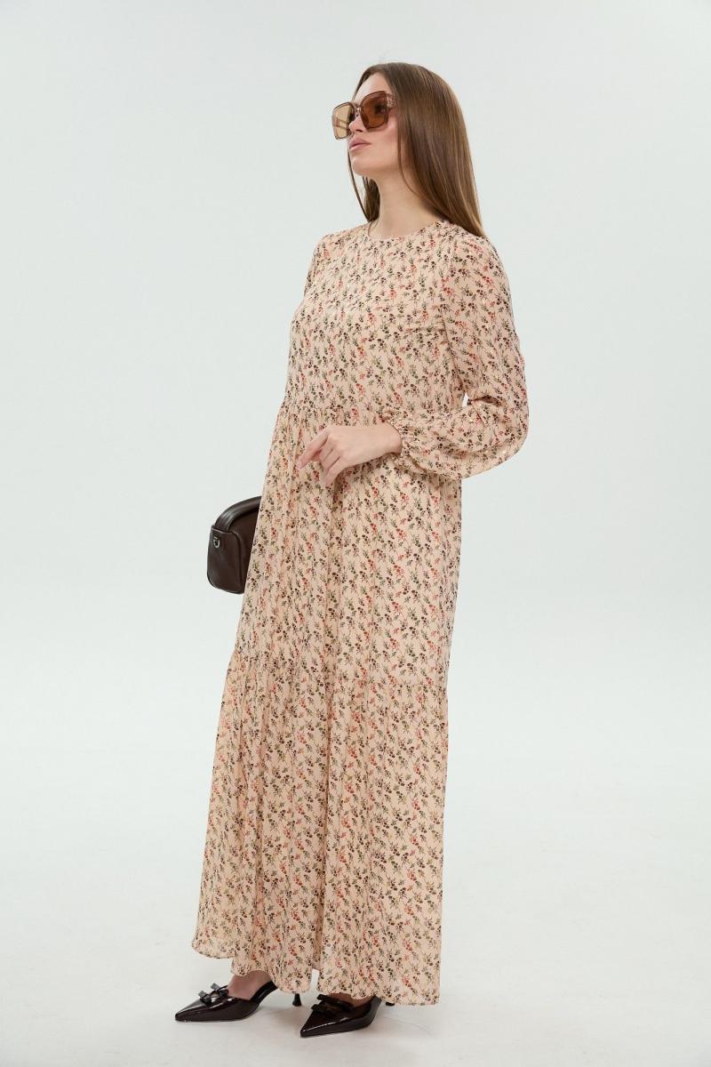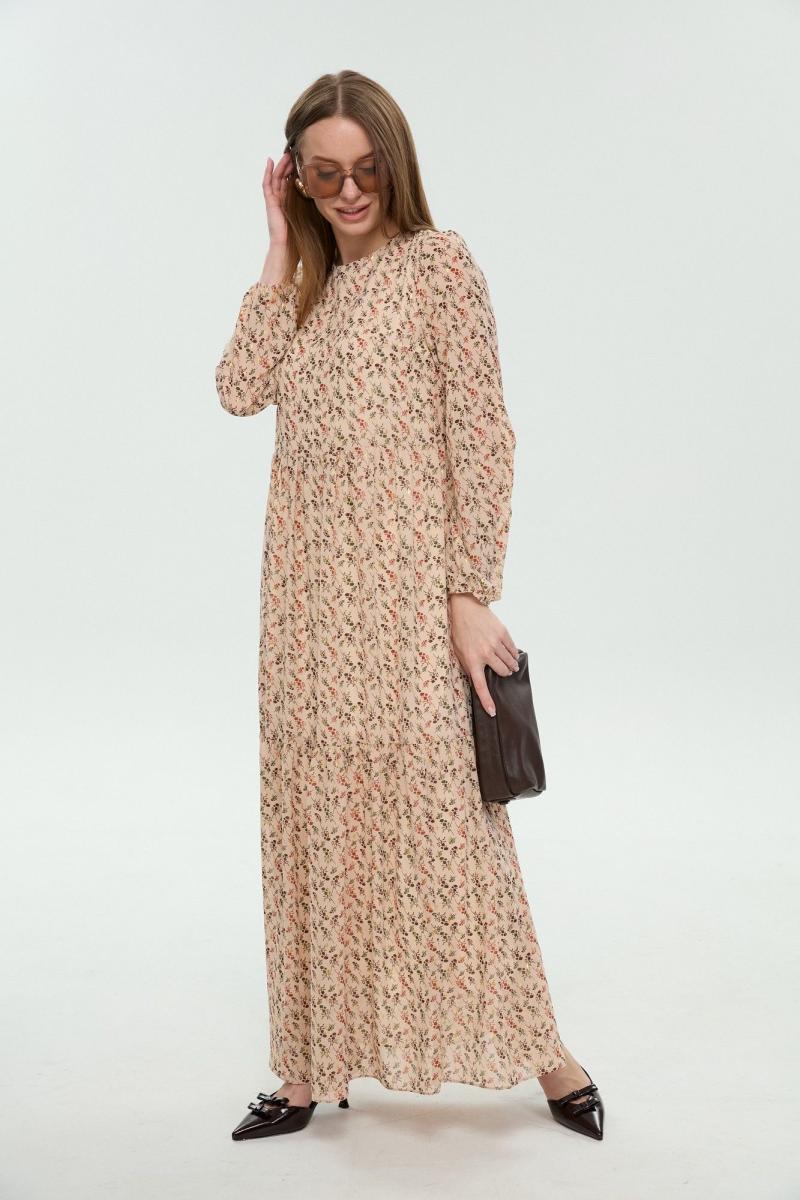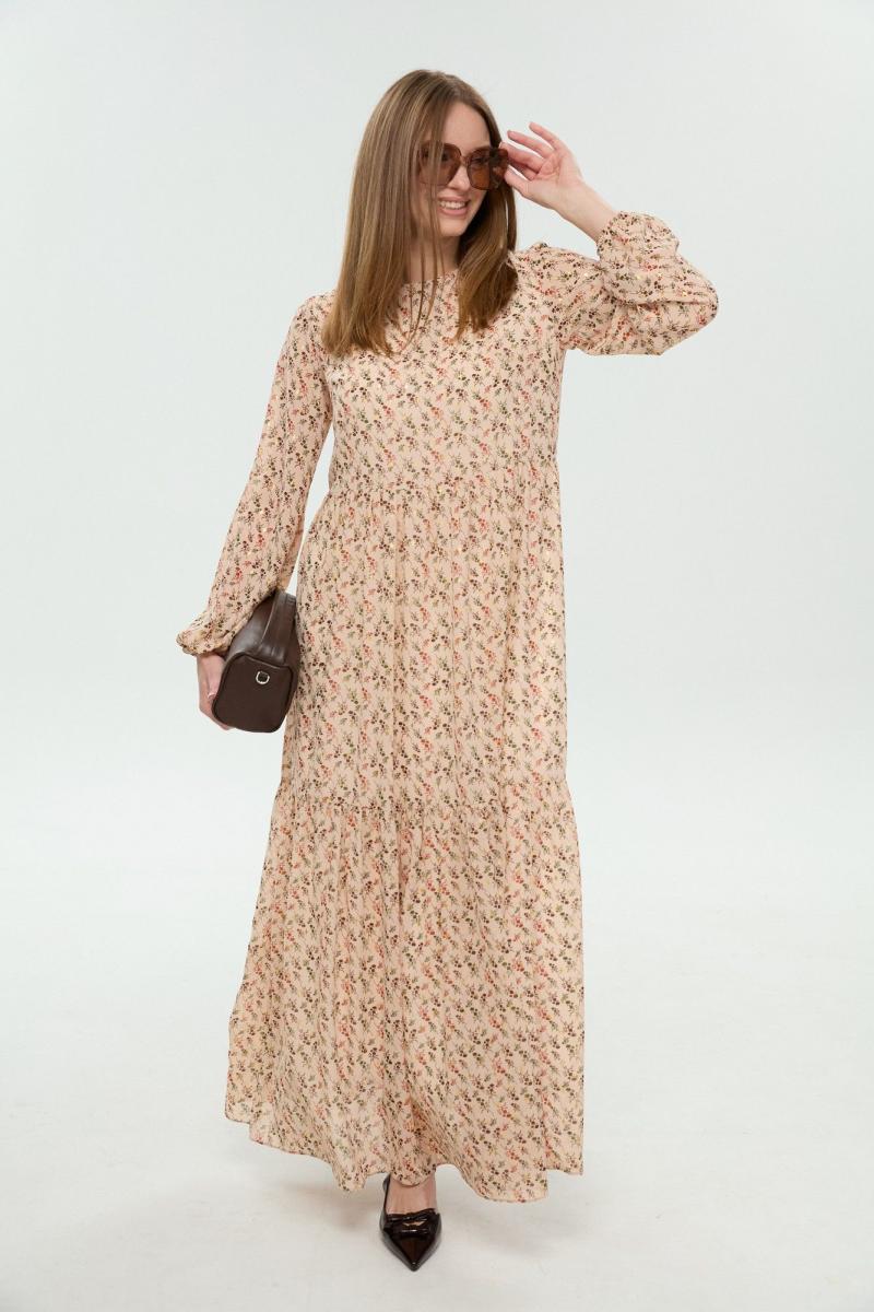 Платье макси прямого силуэта с округлым вырезом, отрезное по линии талии. Рукав немного приспущен, нижний край рукавов оформлен резинкой. По спинке вырез капелька с застёжкой на пуговицу. Изделие на подкладке. По низу юбки широкий волан.