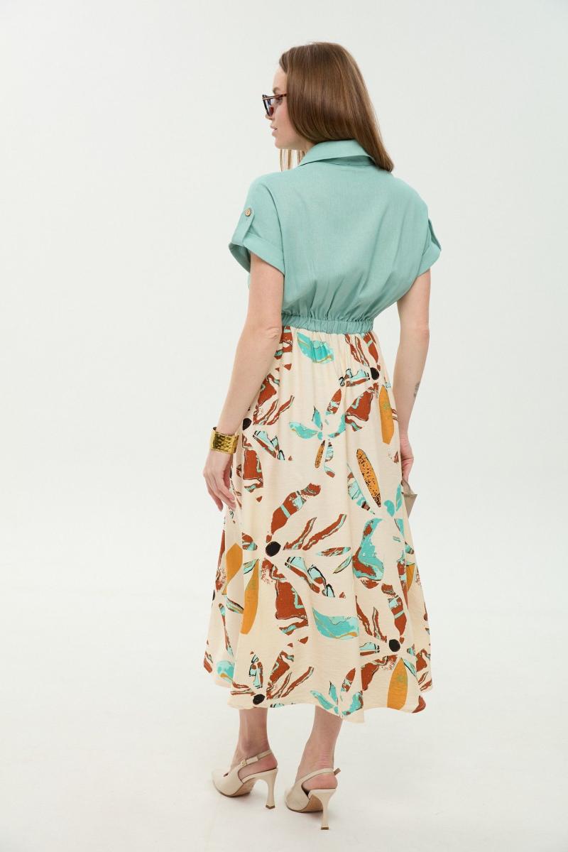 Платье длиной макси умеренного объема прилегающего силуэта, отрезное, на резинке по линии талии. Застежка лифа полочки притачная планка на прорезные петли и пуговицы. На полочке расположены накладные нагрудные карманы. Воротник на отрезной стойке с отложным воротником. Рукав цельнокроеный, короткий, с притачной манжетой, которая фиксируется патами на пуговицу.