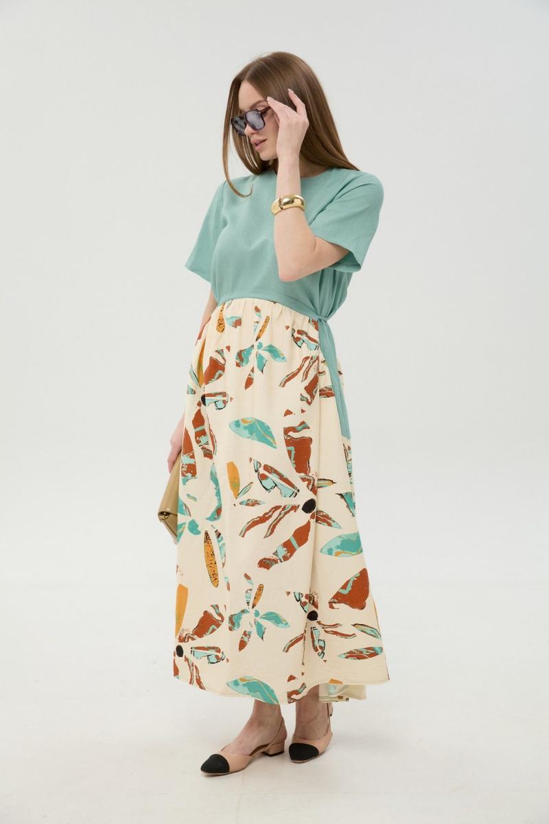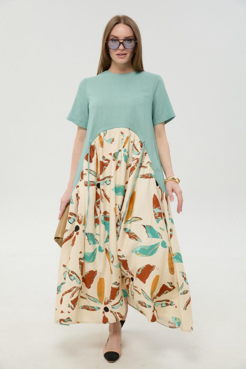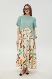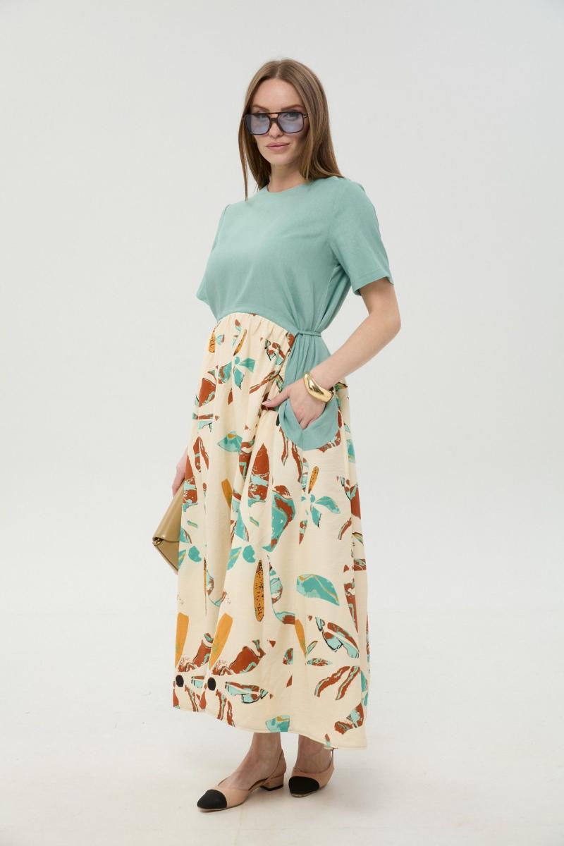 Оригинальное платье макси комбинированное. Лиф прямого кроя, имеет округлый вырез горловины, по линии талии собирается на кулису. По спинке застёжка на потайную молнию. В боковых швах карманы. Рукава короткие. Юбка трапецивидной формы сводного кроя.