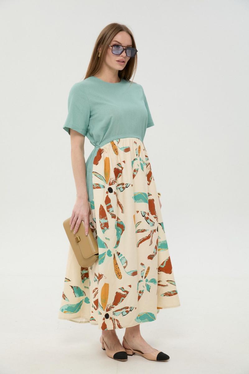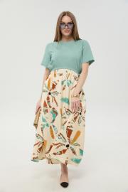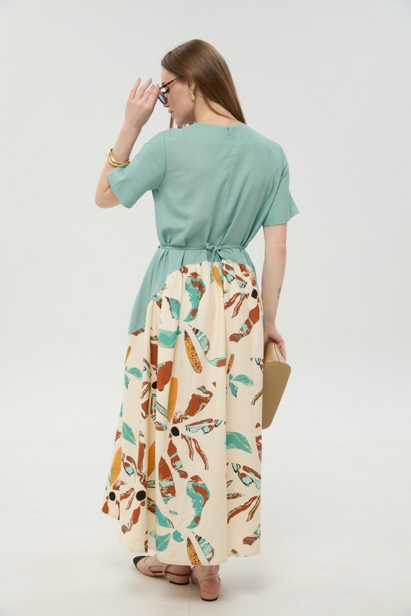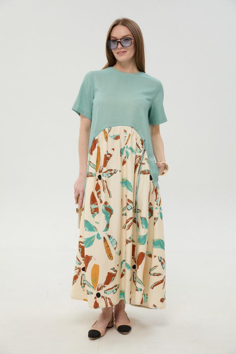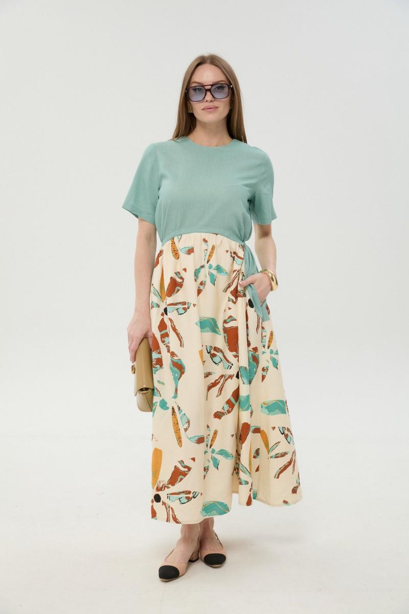 Оригинальное платье макси комбинированное. Лиф прямого кроя, имеет округлый вырез горловины, по линии талии собирается на кулису. По спинке застёжка на потайную молнию. В боковых швах карманы. Рукава короткие. Юбка трапецивидной формы сводного кроя.