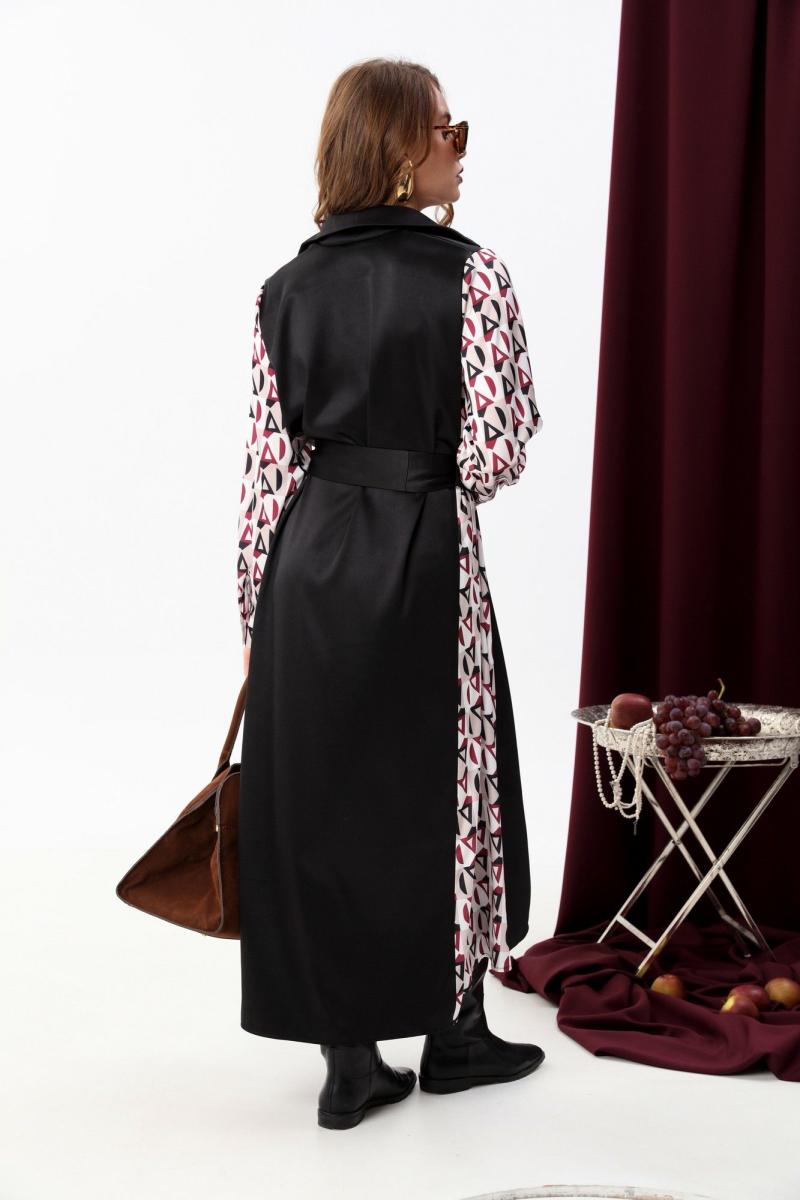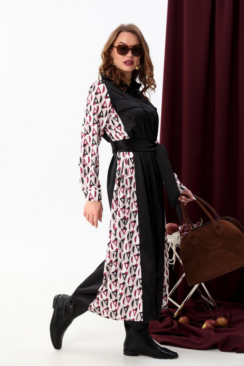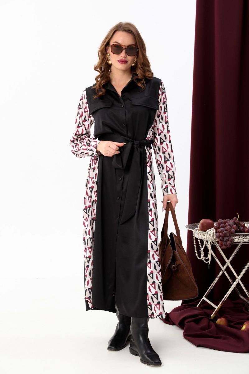 Классическое платье-рубашка прямого кроя в пол. Воротник отложной на стойке. Линия плеча немного приспущена. По груди расположены клапаны. Застёжка центральная на петли и пуговицы. Объёмный рукав с манжетой. Фигурные боковые вставки и рукава из отделочной ткани. Пояс из основной ткани входит в комплект.