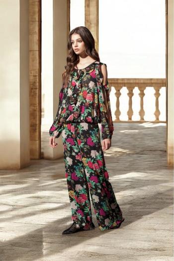 Платье длиной миди полуприлегающего силуэта отрезное по линии талии. Верхняя часть переда со средним швом и вытачкой , нагрудная вытачка объединена с талиевой вытачкой. Нижняя часть переда со средним швом и талиевыми вытачками. Вытачки верхней и нижней частей переда расположены на одной оси. Верхняя часть спинки со средним швом и талиевой вытачкой. Нижняя часть спинки со средним швом, талиевой вытачкой. Рукав втачной двухшовный. В шве по переднему перекату располагается разрез. Вырез горловины круглой формы, обработан обтачками. Застежка в среднем шве спинки на потайную тесьму-молнию. Платье декорировано тесьмой из пайеток.