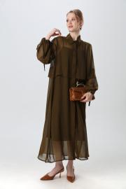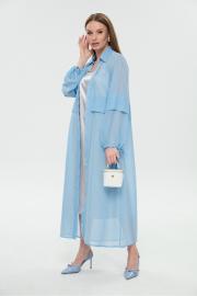 Платье макси с центральной отрезной застёжкой на потайную планку на петли и пуговицы.По переду и спинке цельнокроеные складки на уровне талии. Рукав втачной,одношовный рубашечноно типа. По низу рукава пробиты петли и вставлена завязка для фиксации сборки . Воротник рубашечный стояче отложной.