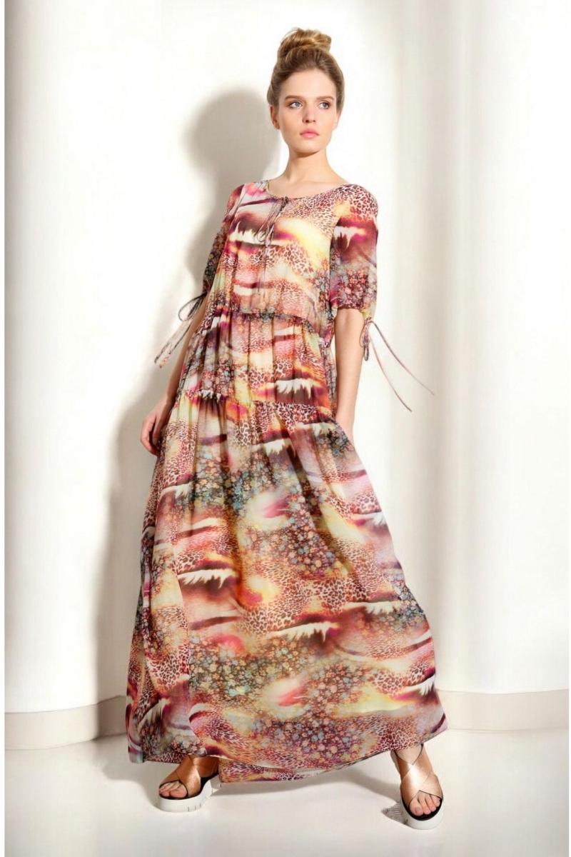 Стильное платье из нежного шифона с принтом объемного силуэта oversize с двумя кулисами: по талии и по бедрам, завязывающимися сбоку на шнурки. Горловина углубленная. Рукава втачные длиной до локтя внизу на стягивающей кулиске. Платье на тонкой хлопковой подкладке.