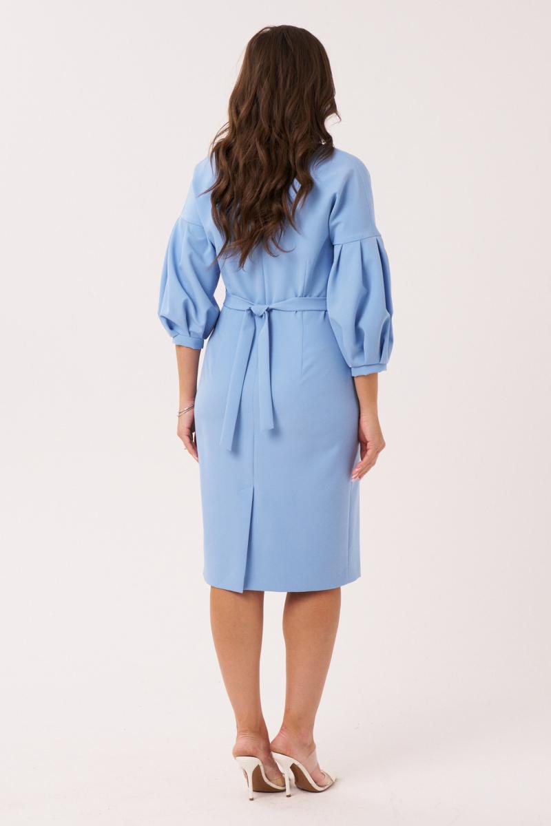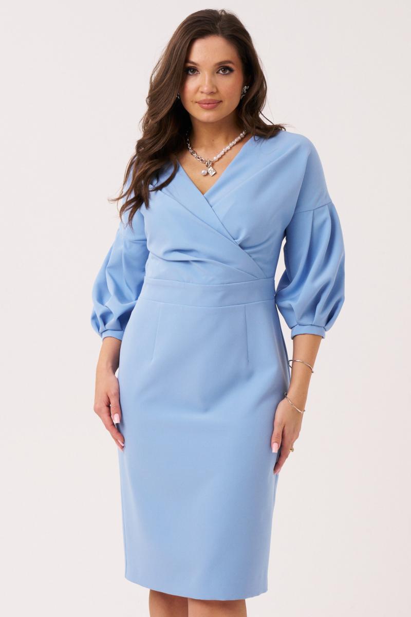 Это элегантное женское платье голубого оттенка, выполненное из смесовой ткани, идеально подходит для повседневной носки. Платье на запах с изящными складками создает легкий и романтичный образ, подчеркивая женственность и комфорт. Свободный силуэт платья обеспечивает удобство и свободу движений. V-образный вырез на запах визуально удлиняет шею и добавляет изысканности. Отрезной пояс по линии талии подчеркивает фигуру, а дополнительно притаченный пояс позволяет регулировать посадку. Спинка со средним швом и двумя талиевыми вытачками для лучшей посадки. В среднем шве спинки расположена потайная застежка-молния для удобства надевания. Шлица в среднем шве спинки добавляет свободы движений и стильный акцент. Рукава втачные со спущенным плечом, создающие расслабленный вид. Низ рукава со складками обработан притачной манжетой для аккуратного завершения. Это платье станет отличным выбором для повседневной носки — его можно легко сочетать с различными аксессуарами и обувью. Легкость ткани обеспечивает комфорт в течение всего дня, а стильный дизайн позволяет выглядеть элегантно в любой ситуации. Платье подчеркнет индивидуальность и вкус современной женщины, делая ее образ ярким и запоминающимся.