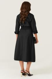 Женское платье из хлопчатобумажной ткани черного цвета для повседневной носки. Модель выполнена в свободном силуэте, расширяющемся к низу, длиной миди. Воротник обработан пиджачным стилем с лацканами, на одном из которых выполнена вышивка мимозы, придающая образу изящность.