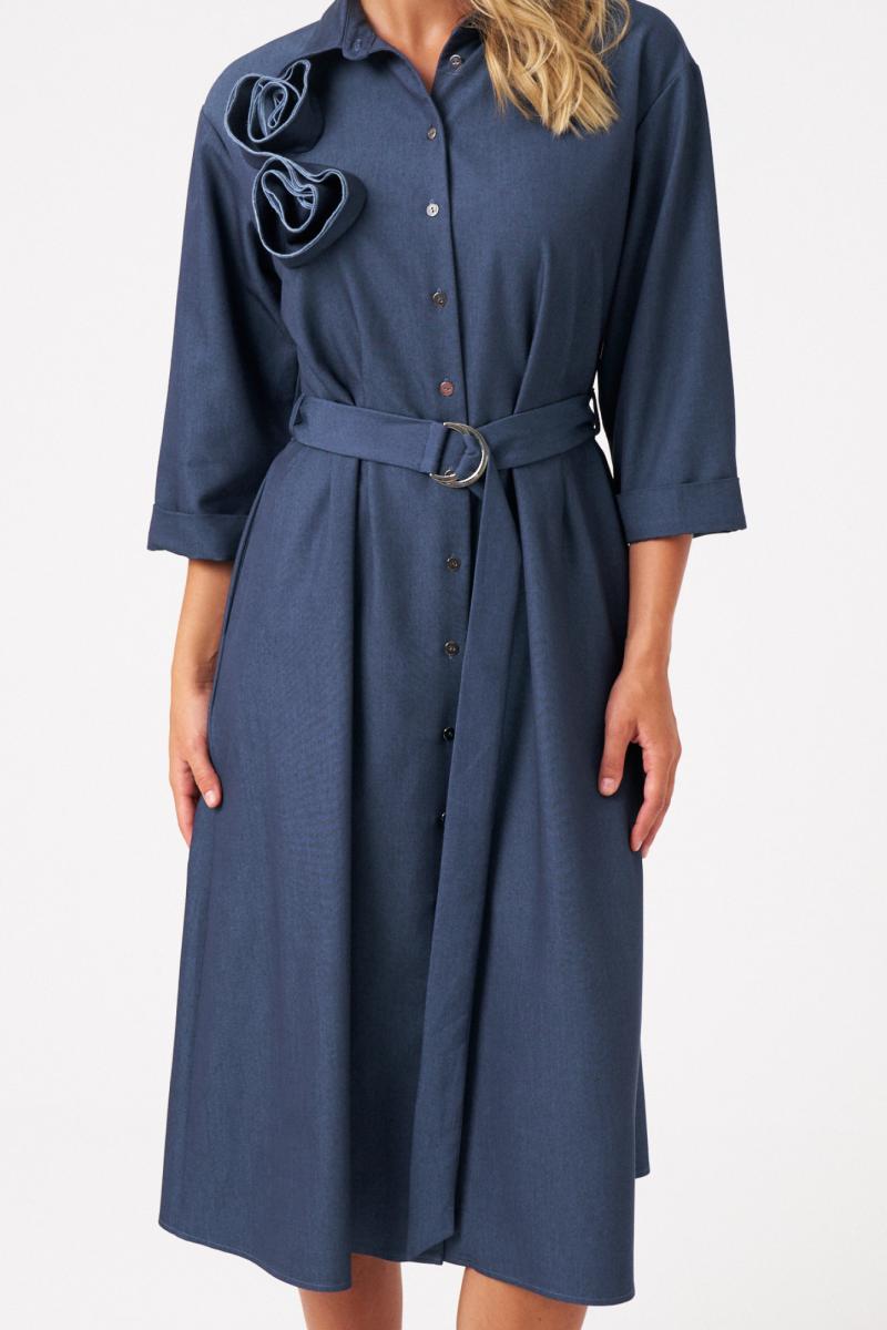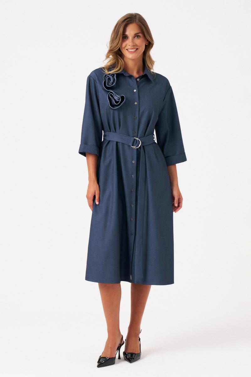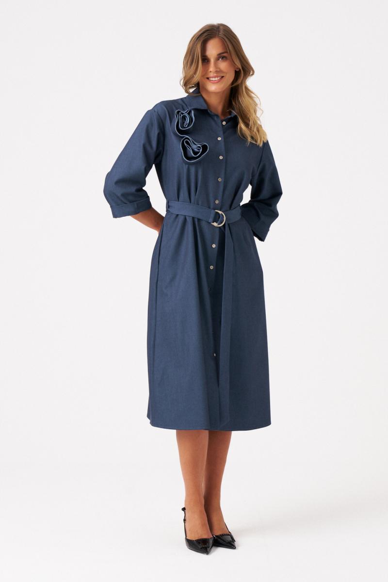 Классический дизайн дополняется центральной бортовой застежкой на обметанные петли и пуговицы, придающей элегантности и практичности. Особое внимание привлекают защипы по талии, которые создают утонченный силуэт, а также дизайнерский декор в виде цветка из основной ткани, добавляющий нотку изысканности. Спинка со средним швом и защипами обеспечивает идеальную посадку, а потайные карманы в боковых швах делают платье еще более удобным. Шлевки позволяют носить модель с поясом, подчеркивая линию талии.