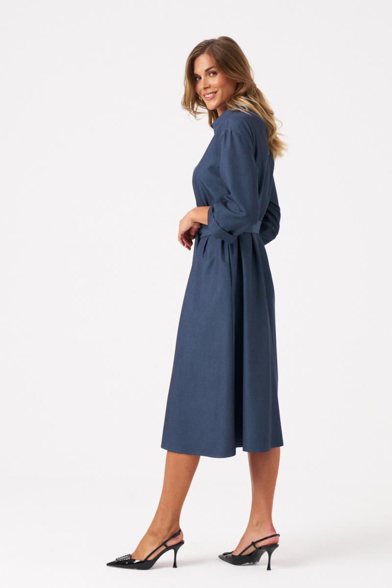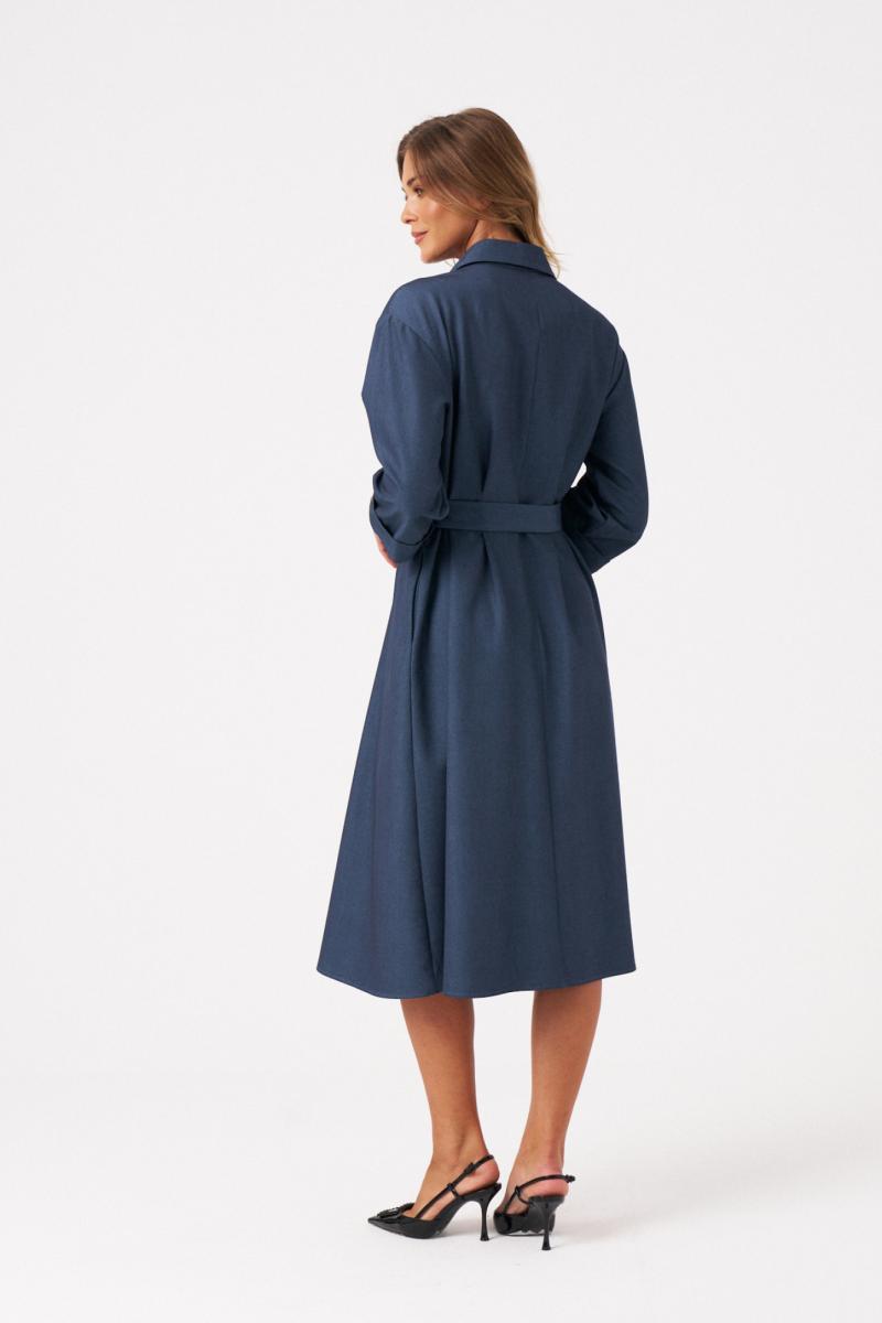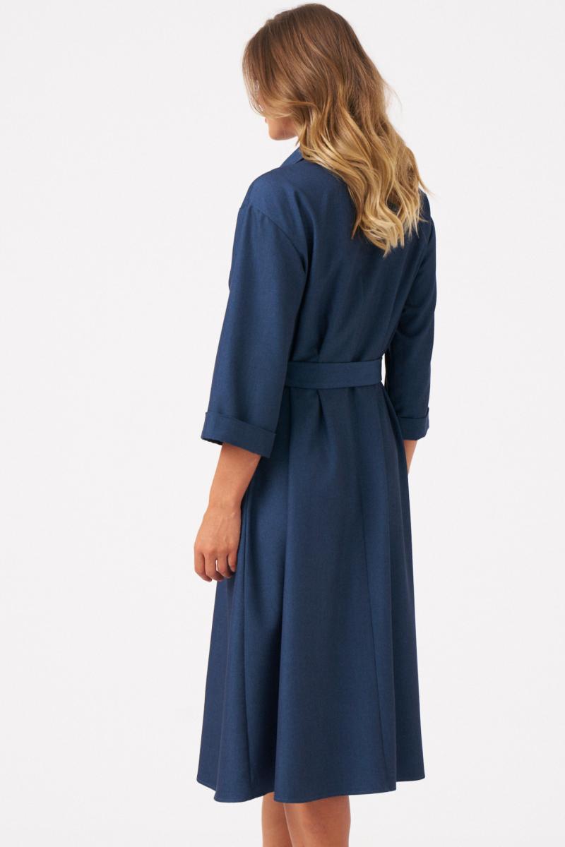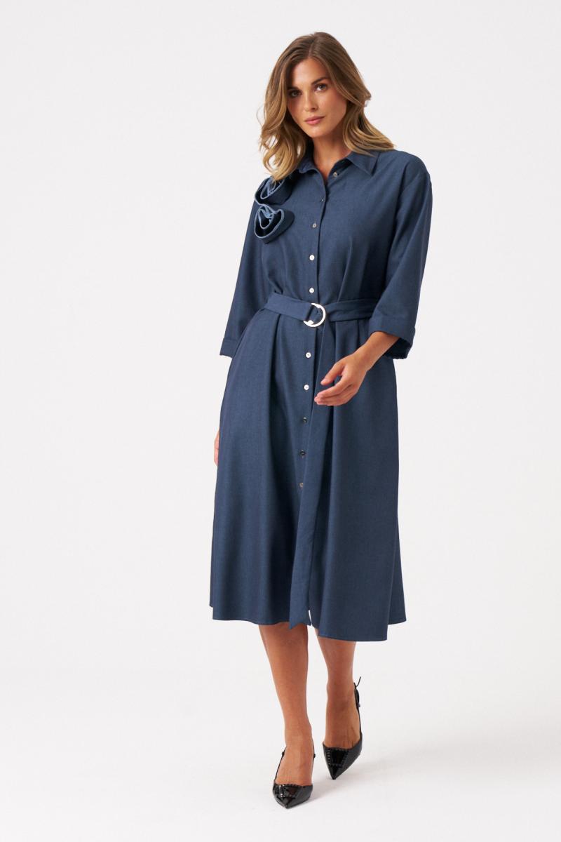 Классический дизайн дополняется центральной бортовой застежкой на обметанные петли и пуговицы, придающей элегантности и практичности. Особое внимание привлекают защипы по талии, которые создают утонченный силуэт, а также дизайнерский декор в виде цветка из основной ткани, добавляющий нотку изысканности. Спинка со средним швом и защипами обеспечивает идеальную посадку, а потайные карманы в боковых швах делают платье еще более удобным. Шлевки позволяют носить модель с поясом, подчеркивая линию талии.
