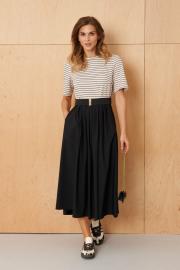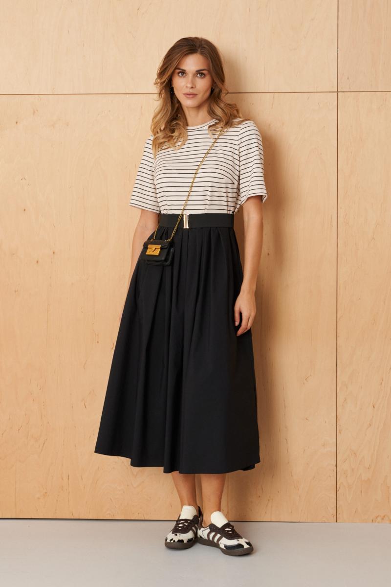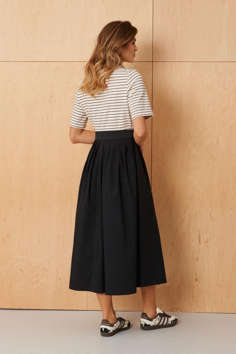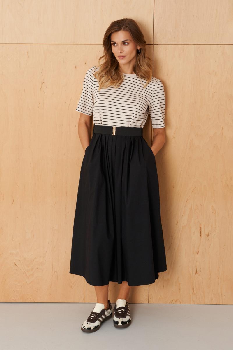 Это женское платье выполнено из комбинации мягкого трикотажа и текстильных тканей, что обеспечивает комфорт и элегантный вид. Модель отрезная по линии талии, что подчеркивает фигуру и создает гармоничный силуэт. Лиф переда украшен двумя нагрудными вытачками, придающими верхней части платья структурированности и аккуратности. Переднее полотнище юбки и задняя часть выполнены с мягкими складками, добавляющими образу легкости и движения. Расширенная горловина создает свободный и выразительный вырез, подходит для разнообразных стилей и позволяет носить платье с украшениями или без. Втачные рукава длиной чуть ниже локтя обеспечивают комфорт и универсальность, идеально подходящие для разных сезонов. Платье оснащено шлевками под пояс, что позволяет дополнить его аксессуаром для акцента на талии, а в комплект входит пояс на резинке, который можно легко регулировать по объему. Длина изделия — миди, что делает его современным и подходящим для различных мероприятий, деловых и повседневных образов. Цвет платья — молочно-черный, что придает ему классический и стильный вид. Такое платье отлично подойдет для создания элегантных и комфортных образов на каждый день или специальные случаи.