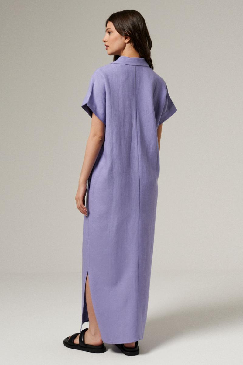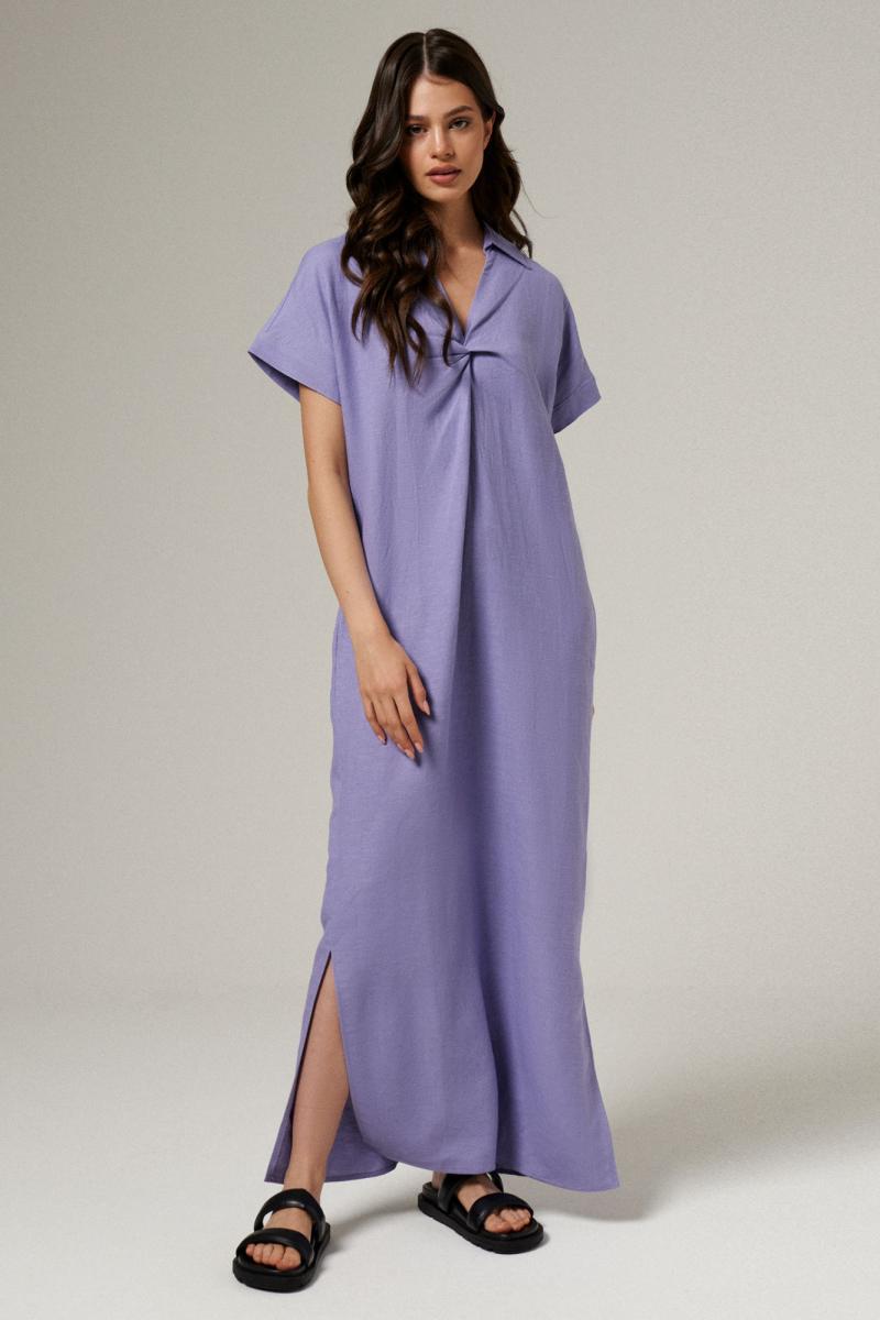 Платье женское из льняной ткани для повседневной носки. Платье прямого кроя с коротким рукавом. В боковых швах прорезные карманы, разрезы от низа изделия. На передней части изделия дизайнерский элемент.