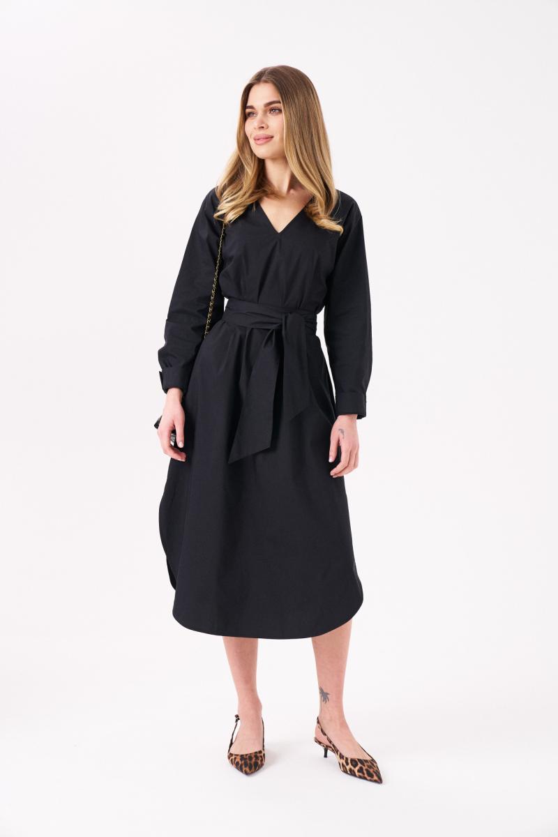 Платье из хлопковой ткани для повседневной носки. Платье прямого силуэта с разрезами в боковых швах. Изделие с длинным втачным рукавом оформленным притачной манжетой. В боковых швах прорезные карманы. Горловина V-образная. От горловины спинки встречная складка. Платье укомплектовано поясом из основной ткани изделия. Длина изделия до середины голени. 42 Платье: Длина изделия - 117см, Длина рукава - 57см, Ширина плеча - 14,3см, Ширина по бедрам - 64см, Ширина по груди - 56см, Ширина рукава - 24см;