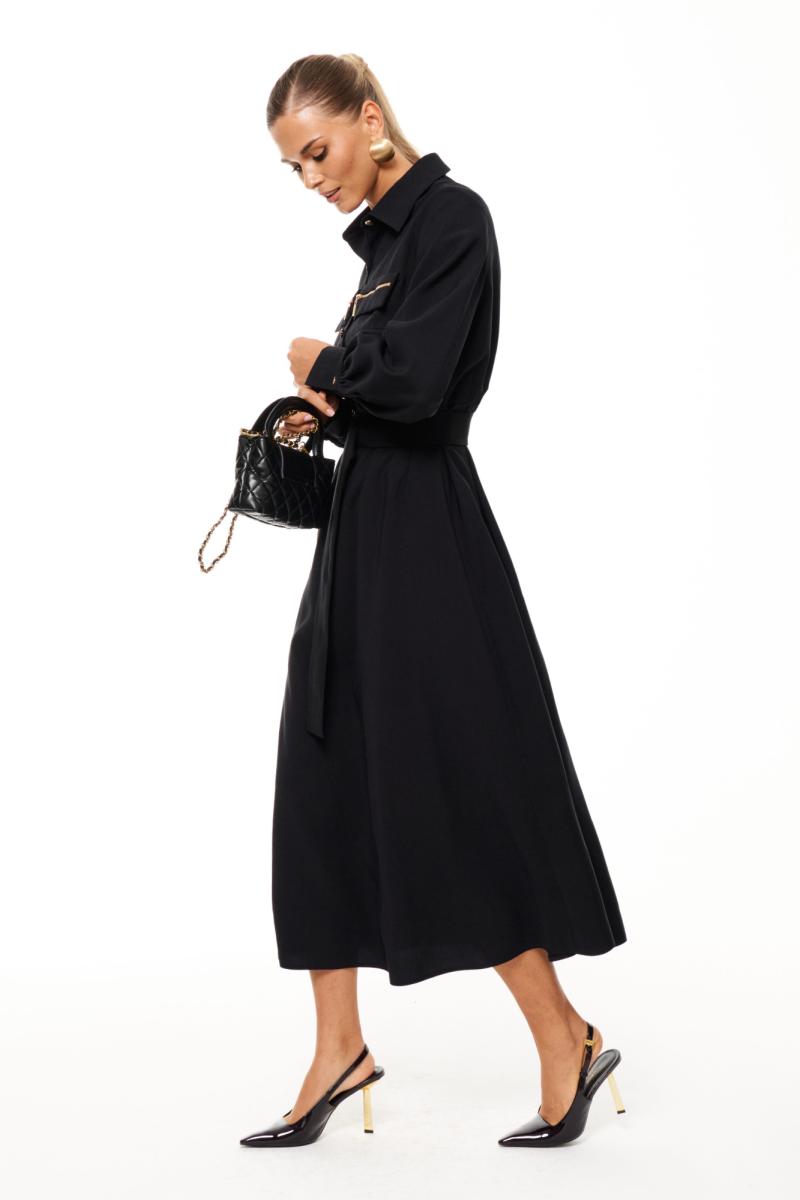 Юбка разведена трапецией, что добавляет изделия нарядный вид и обеспечивает свободу движения. Длина рукава полноценная, что делает платье идеальным для осеннего сезона. Передняя часть платья украшена двумя настрочными клапанами с металлическими молниями, добавляющими современный стильный акцент. Вся фурнитура, включая текстильный ремень на полукольцах, выполнена из металлического материала золотого цвета, что придает изделию дополнительную элегантность.