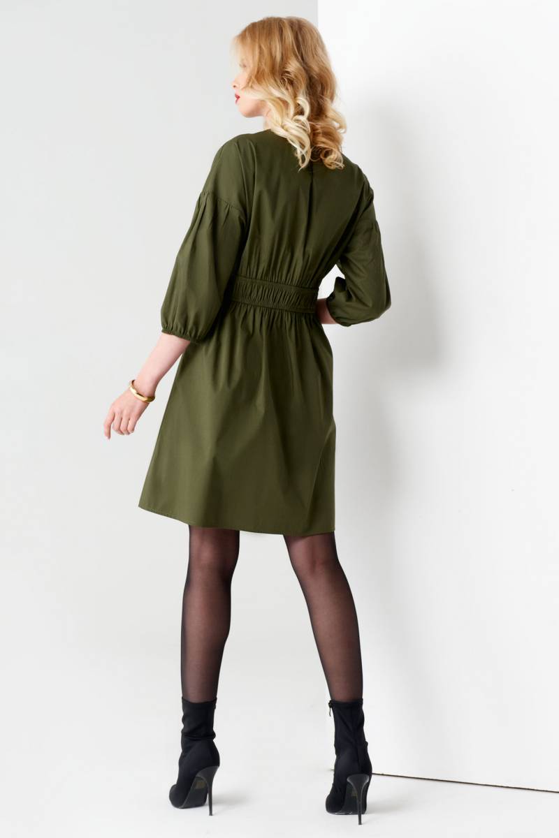 Платье на осень создано в длине выше колена. Расширяющаяся книзу юбка скрывает лишние сантиметры на бедрах. Внимание привлекают свободные рукава 3/4, собранные по нижнему срезу. Платье женское повседневное застегивается на петлю пуговицы, расположенную в разрезе от горловины на спинке.