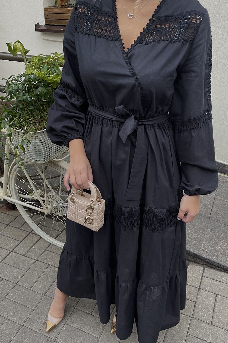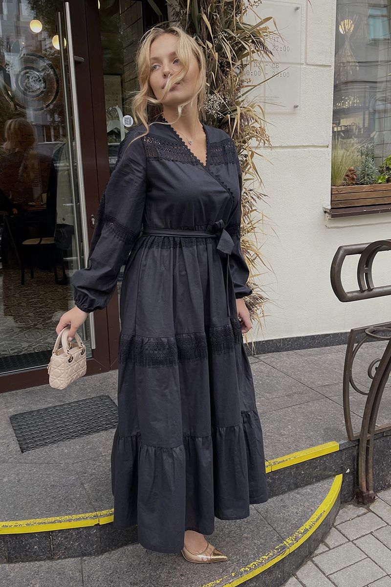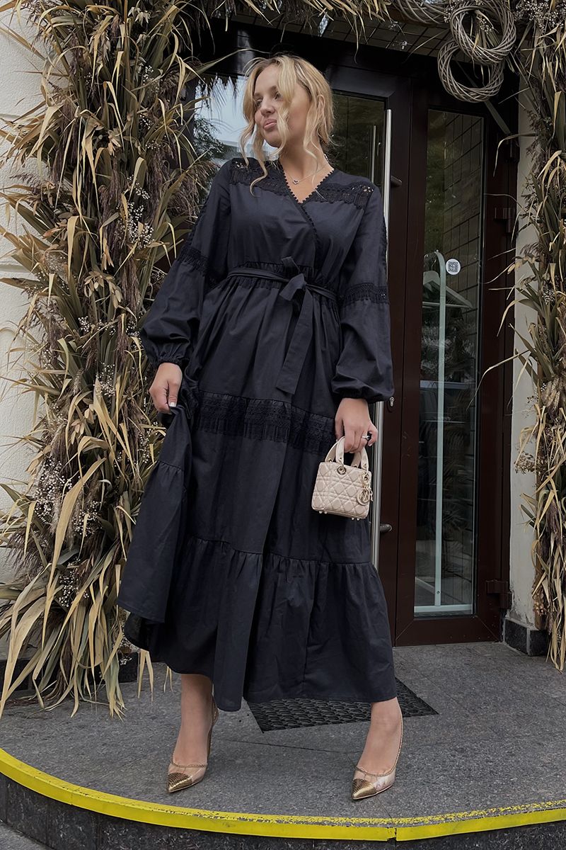 Богемное платье с запахом на груди и с завышенной талией. Многоярусная юбка из трёх воланов. Длина миди. В отделке использовано хлопковое кружево. Идеально сочетается с любой обовью; сапоги, ботинки, кеды, кроссовки, сандали, туфли, босоножки. Отличной подойдёт под любой образ!